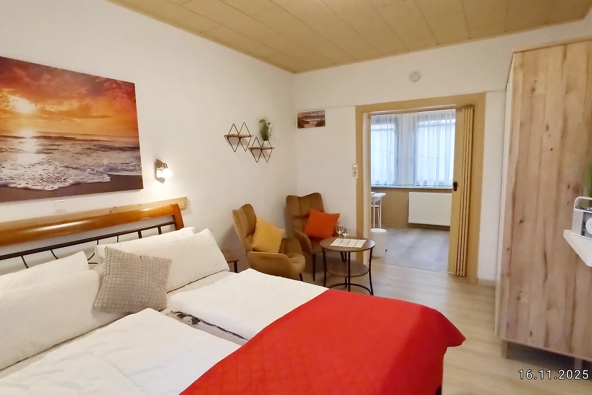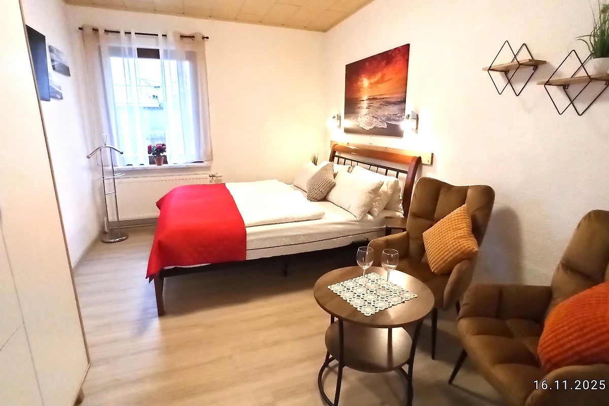 * Die Wohnung mit kombiniertem Wohn-/ Schlafzimmer mit Doppelbett, zwei Sessel, Bestelltisch,