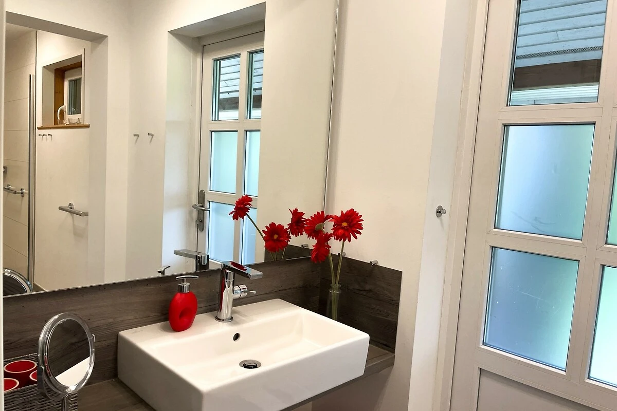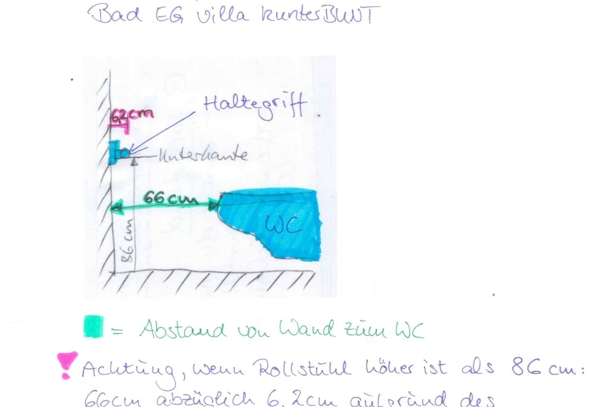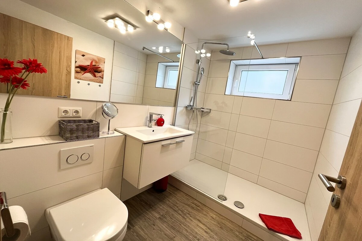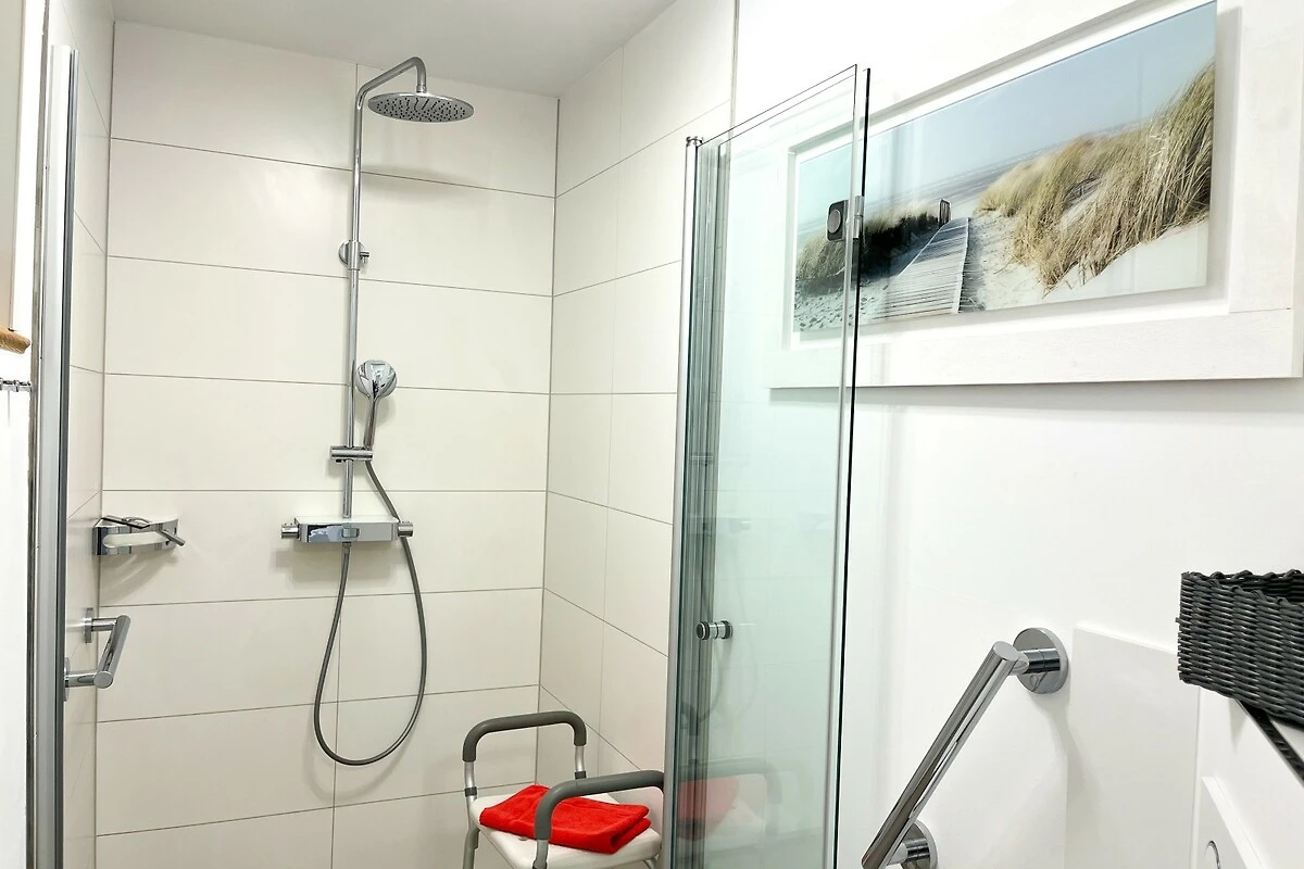 Durch das barrierearme Erdgeschoss des Hauses eignet sich die "villa kunterBUNT" auch gut für Rollstuhlfahrer und Personen mit eingeschränkter Mobilität - auf dieser Ebene befinden sich ein barrierearmes Einzelschlafzimmer, ein barrierearmes Duschbadezimmer, sowie die Küche und das Wohn-/Esszimmer. Das Badezimmer verfügt über eine bodengleiche Dusche mit Duschhocker und Haltegriff, ein WC mit Haltegriffen sowie einen unterfahrbaren Waschtisch.