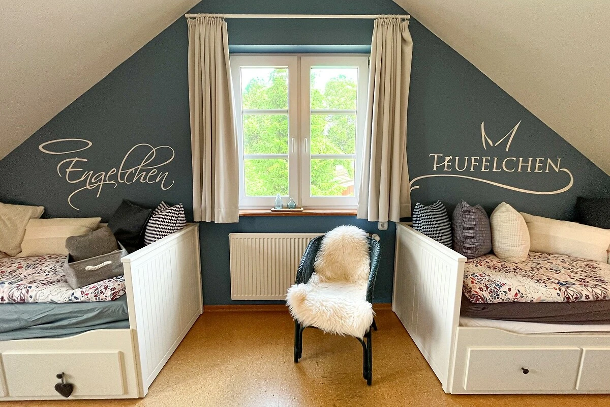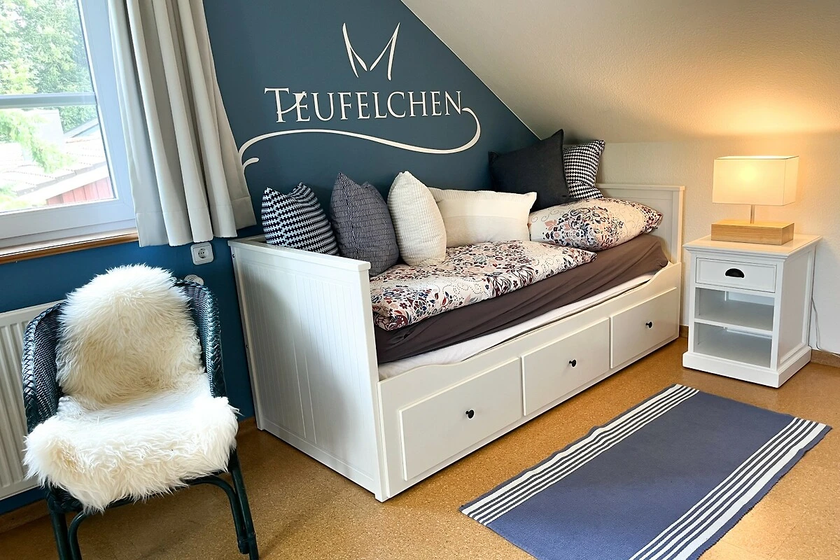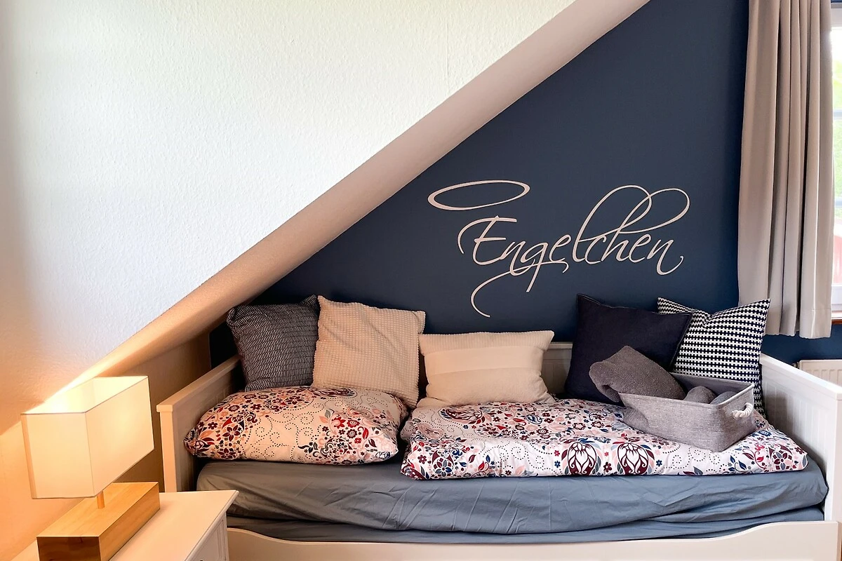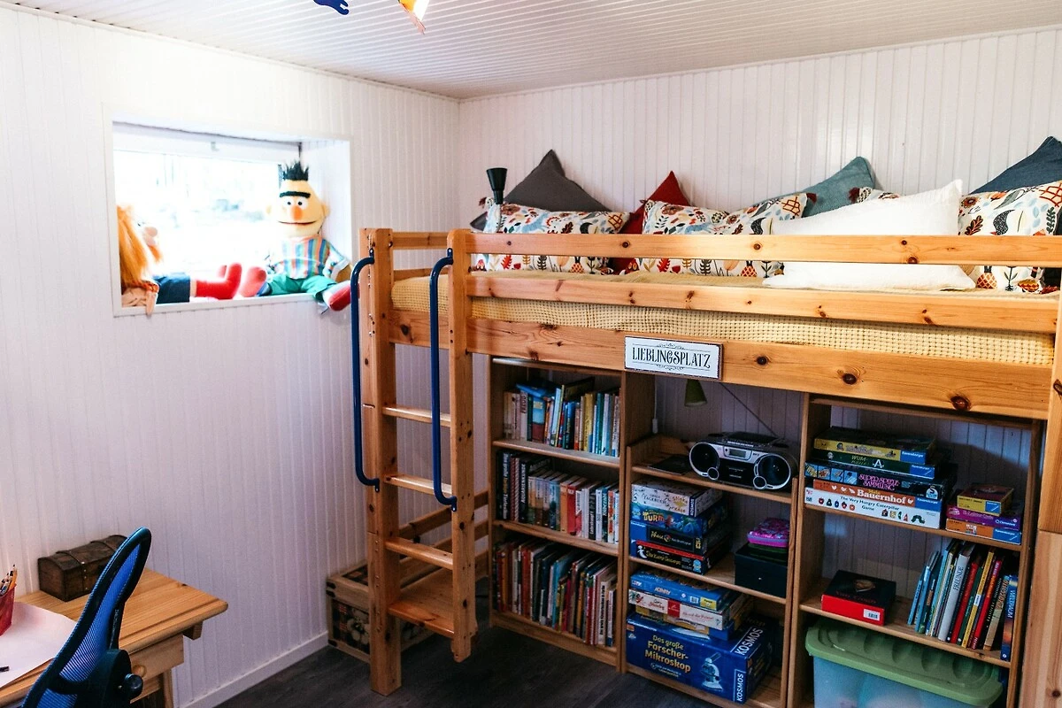 Zwei weitere Schlafräume sind über die Treppe im Obergeschoss zu erreichen und bieten mit 1 Doppelbett und 2 Sofabetten (beide ausziehbar auf 160x200cm) Platz für weitere 5 Personen. Auch für die mediale Unterhaltung ist mit Flachbild-TV, einer Musikanlage und kostenfreiem WLAN gesorgt worden. Im Souterrain des Hauses finden die kleinen Urlaubsgäste jede Menge Beschäftigung im Spielzimmer, welches mit Stockbett, Kinder-DVDs, einem Schreibtisch mit Malsachen, Kinderbüchern und vielen Spielmöglichkeiten von Lego und Playmobil bis hin zu Lillifee bestens ausgestattet ist.