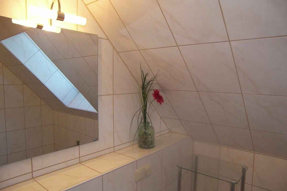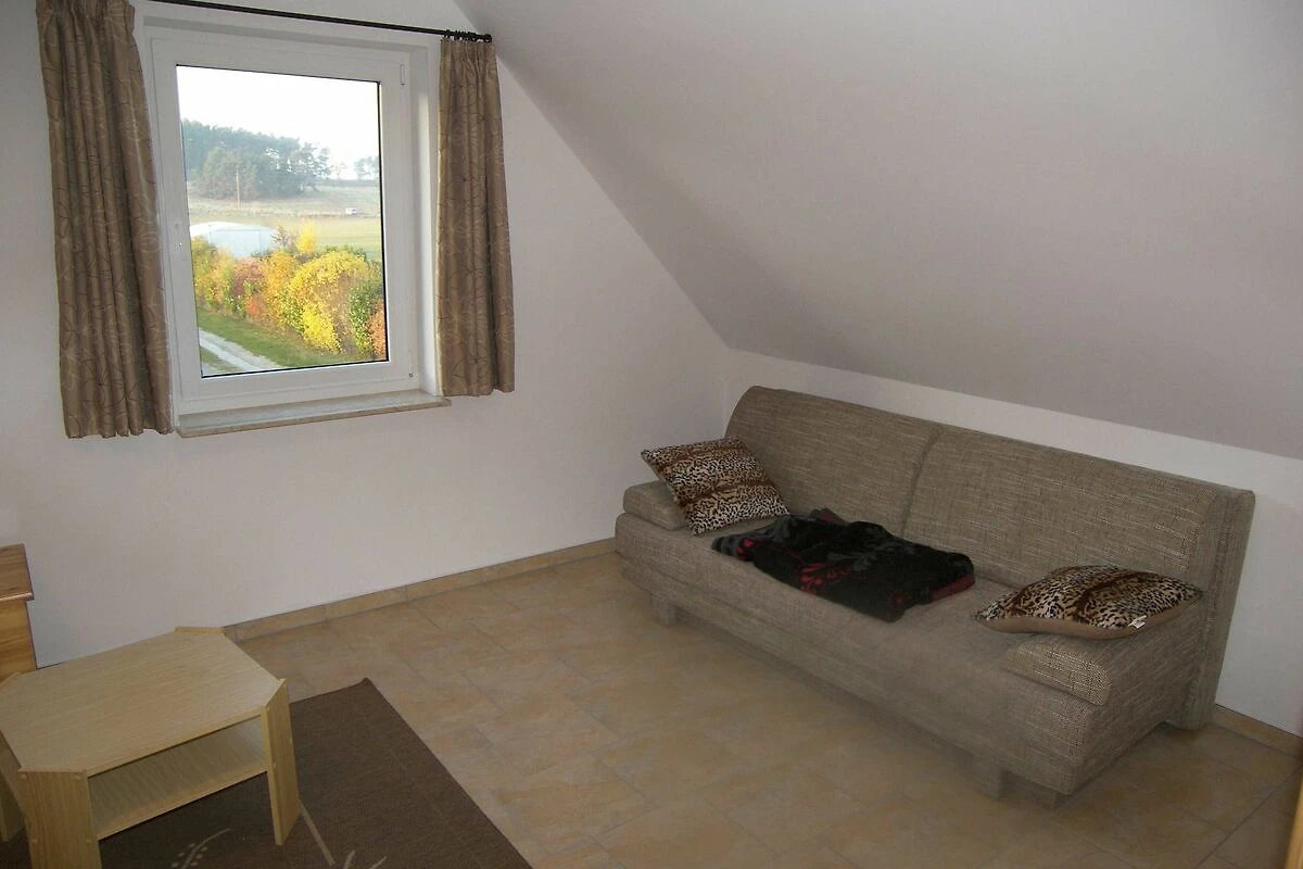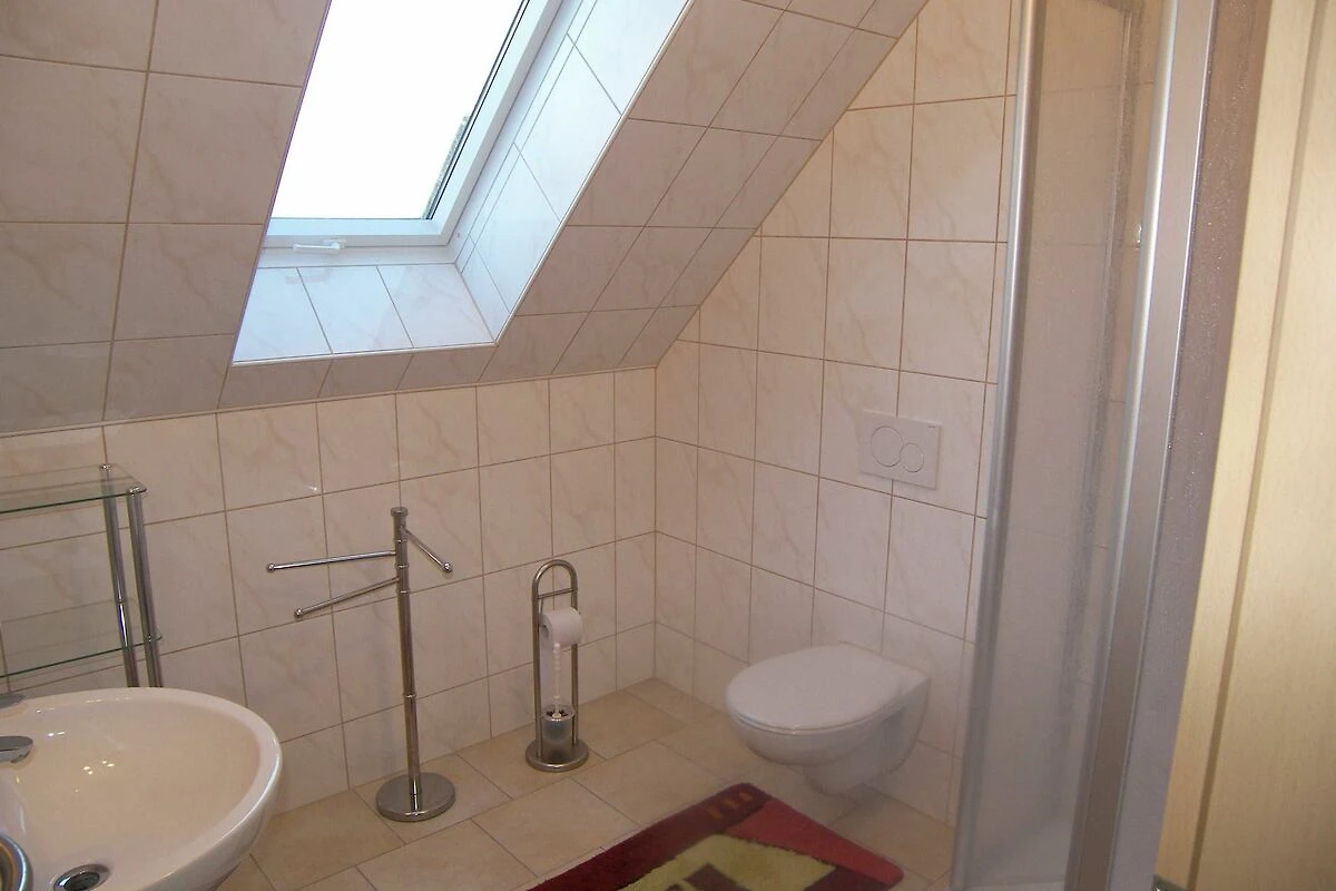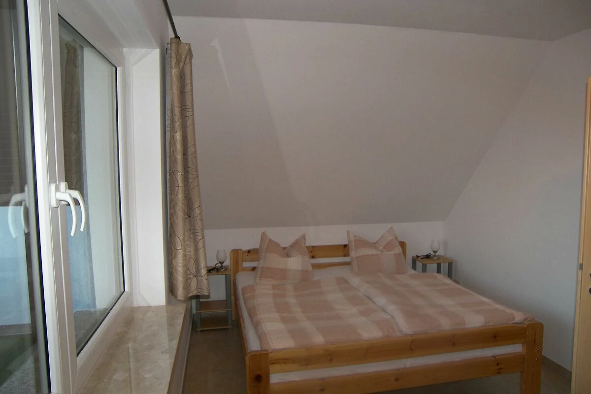 Im Obergeschoss befinden sich zwei Schlafzimmer, ein Schlafzimmer mit Doppelbett sowie angrenzendem Balkon und das zweite Schlafzimmer mit Doppelbett und einer zusätzlichen Couch, die als Aufbettungsmöglichkeit genutzt werden kann. Das Badezimmer im Obergeschoss verfügt ebenfalls über Dusche und WC.