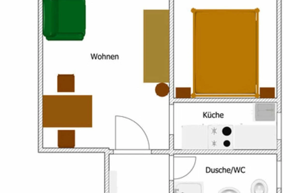 Die 1-Raum-Wohnung ist durch einen Raumteiler in Wohn- und Schlafbereich geteilt.