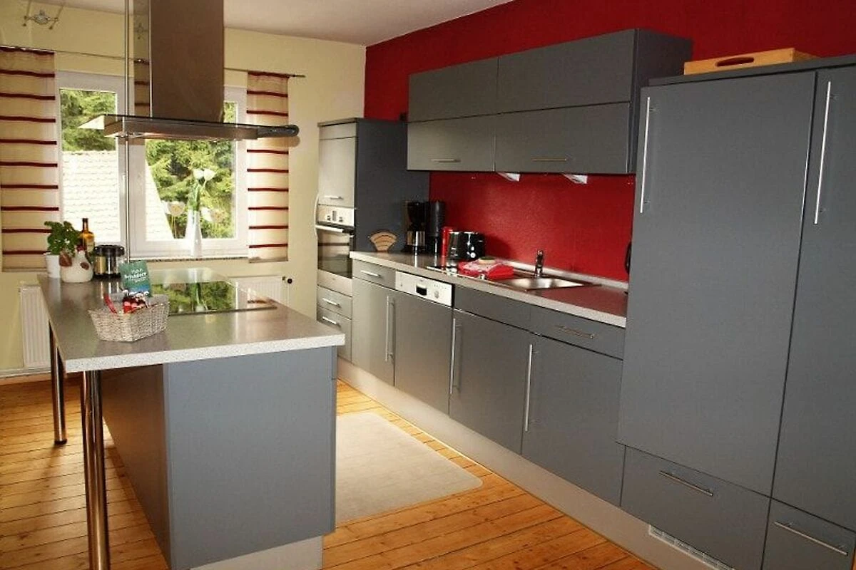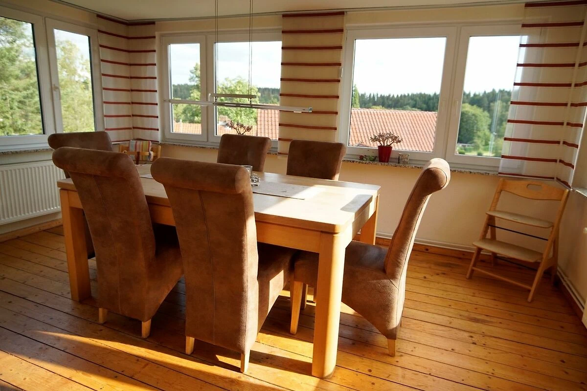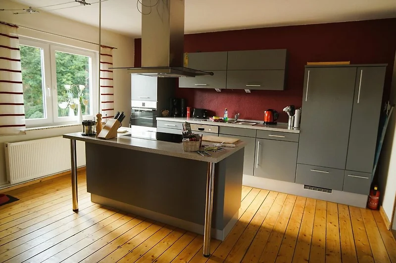 Die offene Küche mit Kochinsel und Induktionsherd verfügt über alle Extras, die es braucht, um das gemeinschaftliche Kochen zu einem echten Vergnügen werden zu lassen. Und im lichtdurchfluteten Esszimmer geniessen Sie nicht nur Ihr Essen am Massivholztisch sondern auch den traumhaften Blick auf die Wälder und den kleinen Ort.