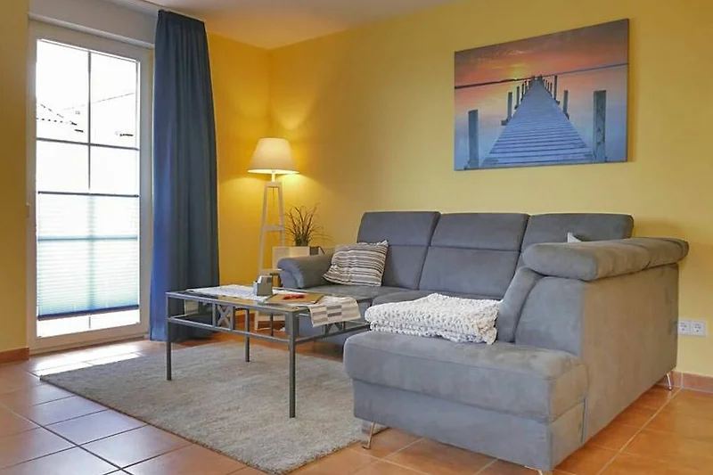 Im Wohnbereich gibt es eine gemütliche Couch.
