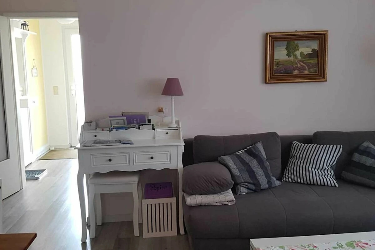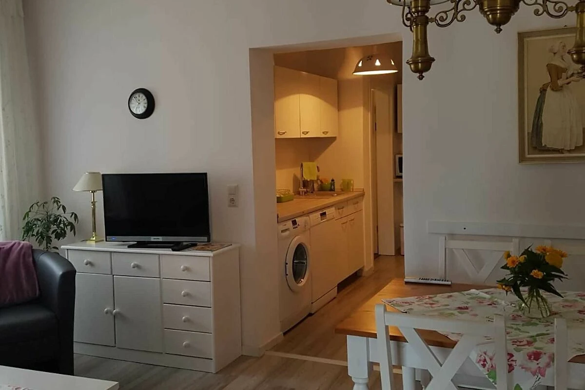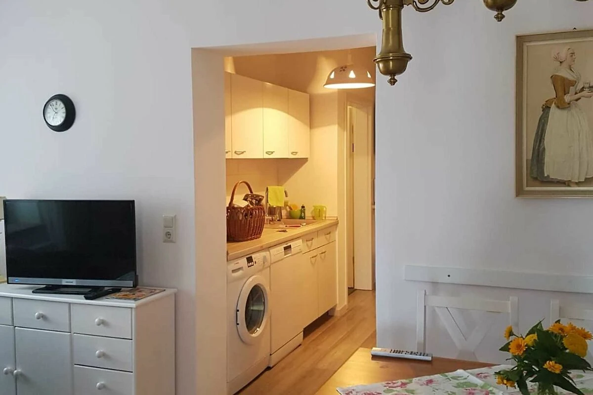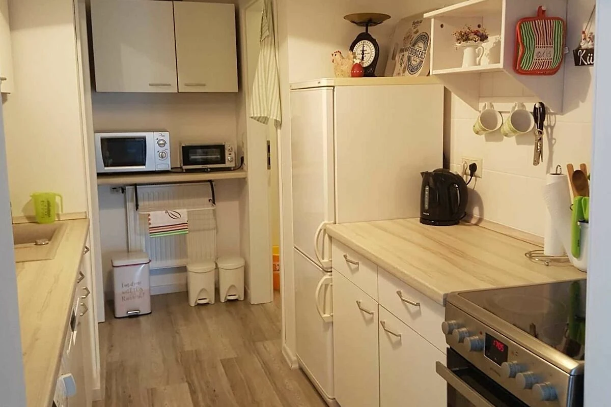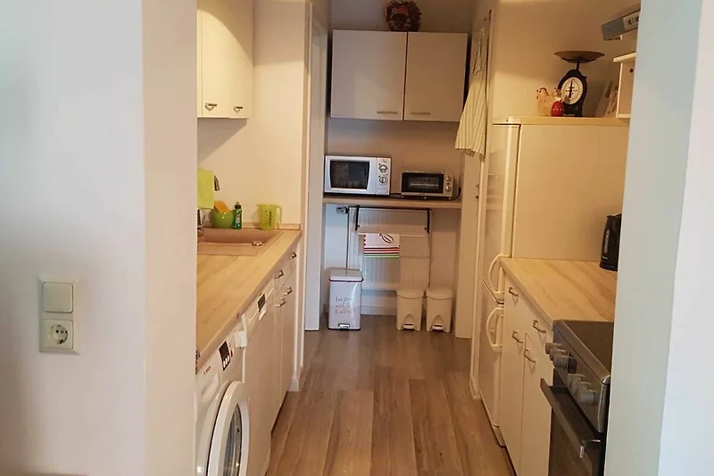 Das Schlafzimmer ist mit einem Doppelbett ausgestattet. Im Wohnzimmer befindet sich eine Schlafcouch für eine Aufbettung für maximal 2 Personen. Eine komplett ausgestattete Küche mit Waschmaschine, Geschirrspüler, Herd, Mikrowelle, Kaffeemaschine und einem Brötchenaufbackofen. Neben der Küche befindet sich eine Kammer, die zum Abstellen der Koffer etc. genutzt werden kann.