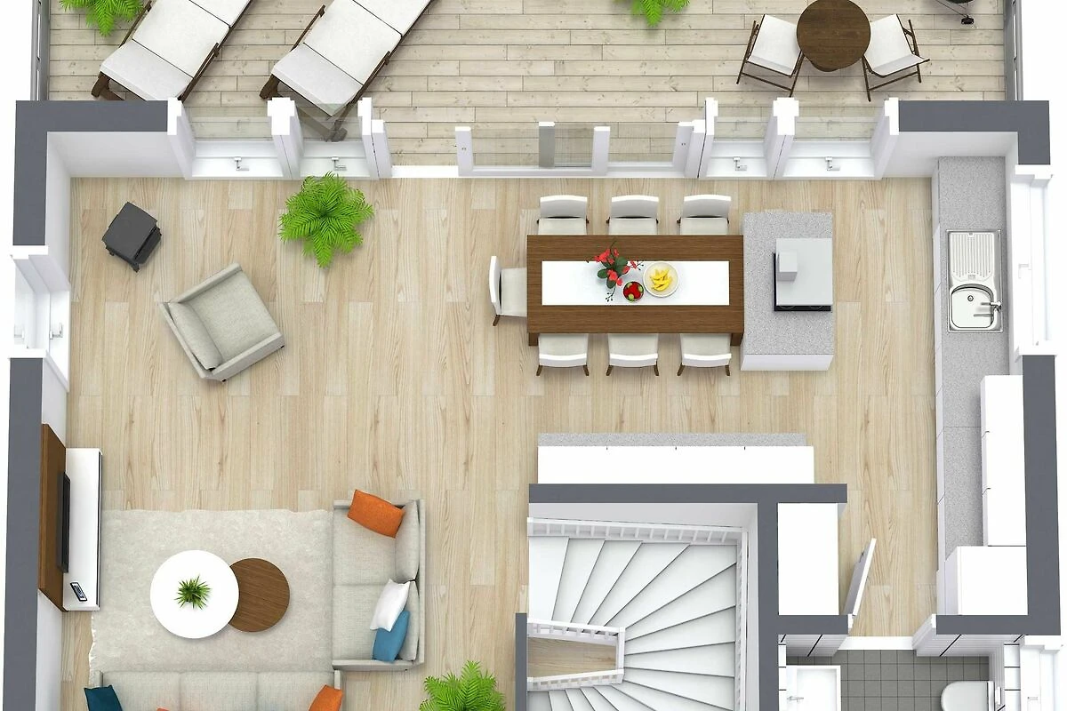 Der lichtdurchflutete Wohnbereich mit Zugang zur Sonnenterrasse, sowie der Küchenbereich und ein separates WC mit Waschbecken befinden sich in der oberen Etage.