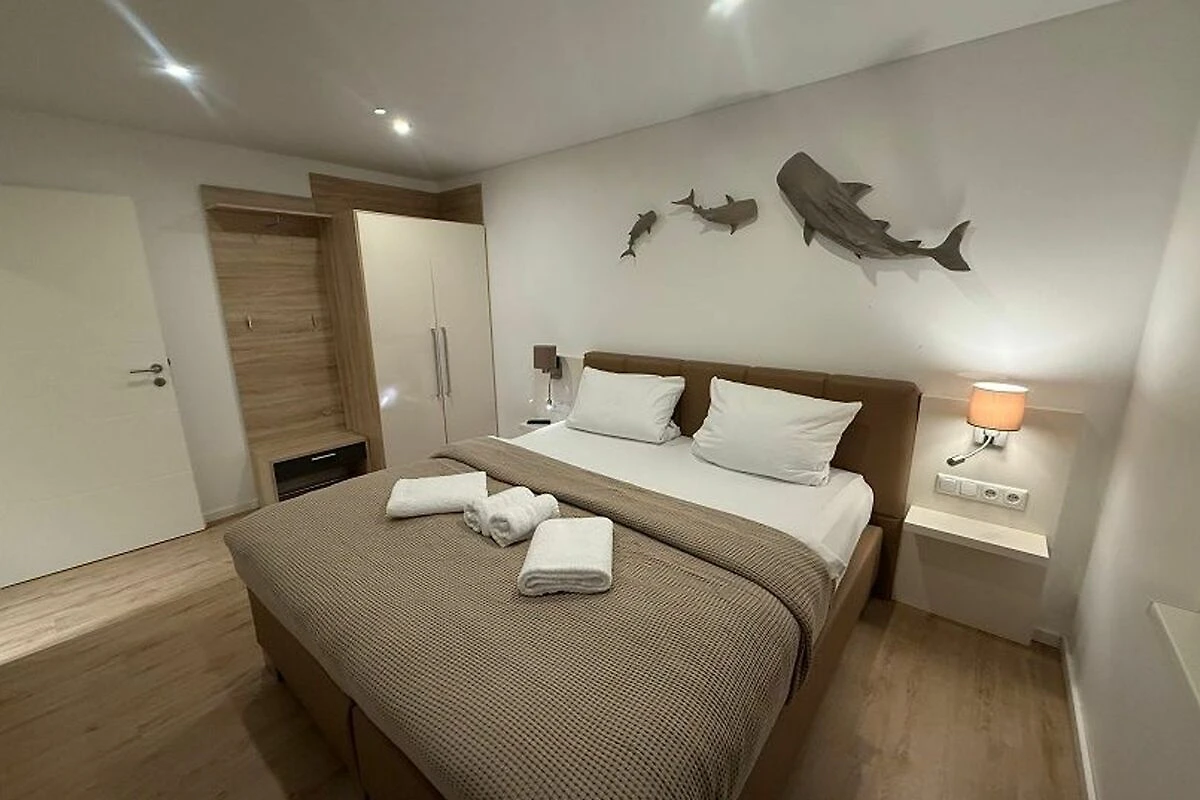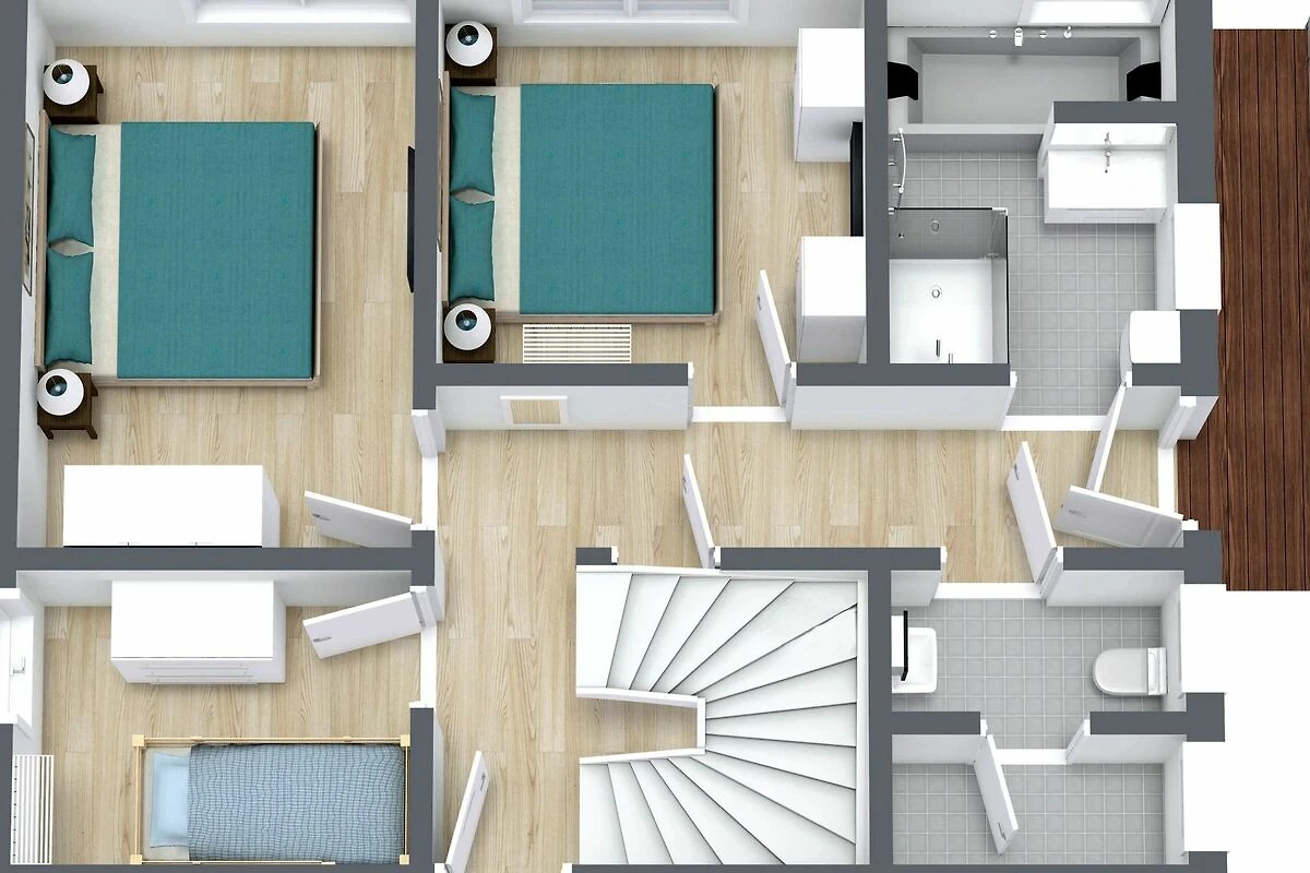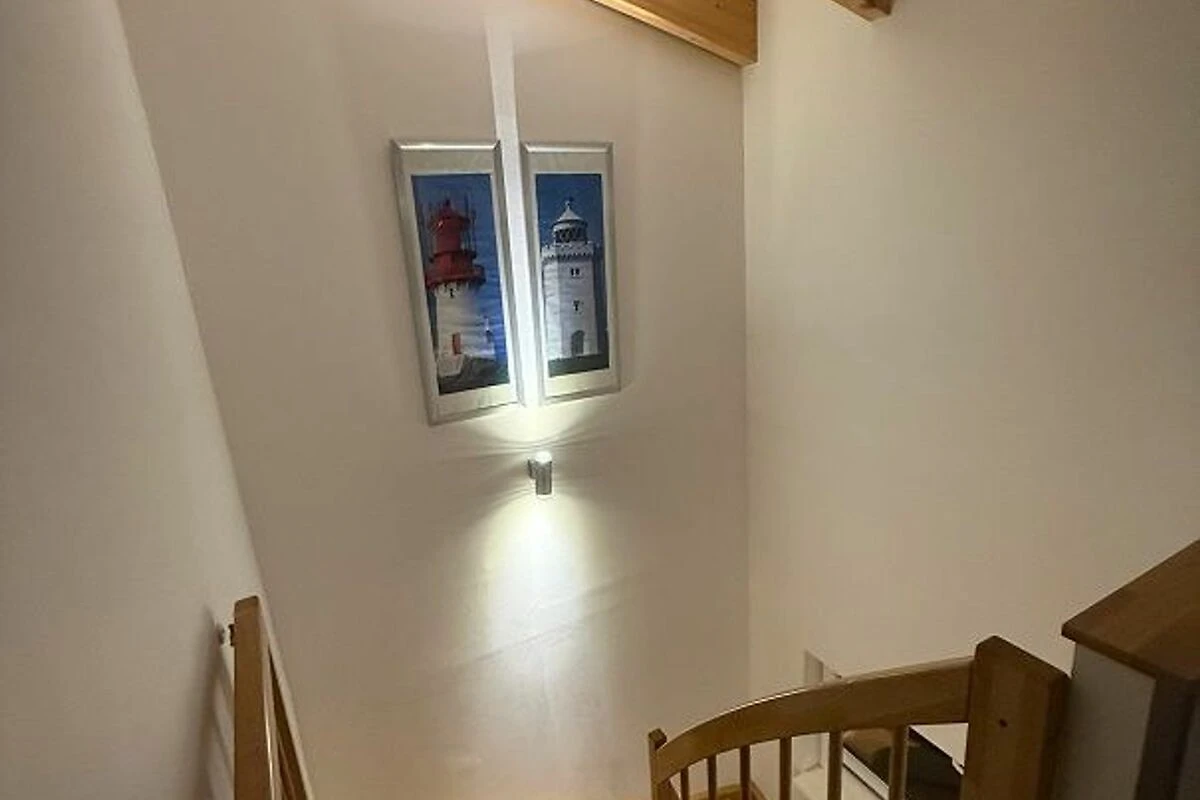 Neben den 3 separaten Schlafzimmern - 2 Schlafzimmer mit jeweils einem Doppelbett, 1 Schlafzimmer mit einem Hochbett für die 5. und 6. Person und für die 7. und 8. Person eine Aufbettung in der 1. Etage im Wohnzimmer, befindet sich ausserdem das Bad mit Dusche/WC im unteren Deck sowie ein Bad mit Waschbecken und WC..