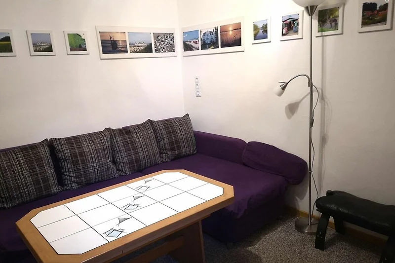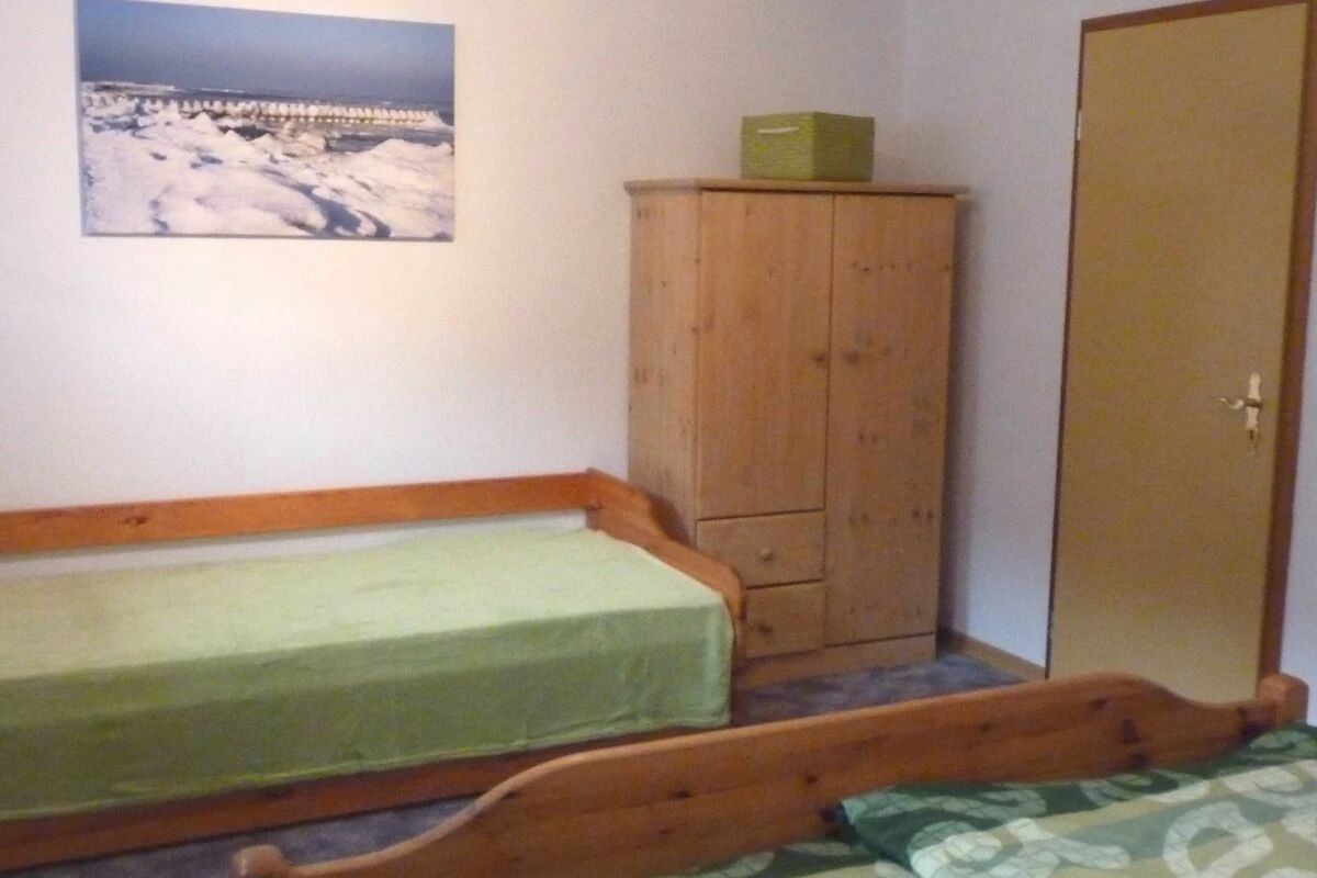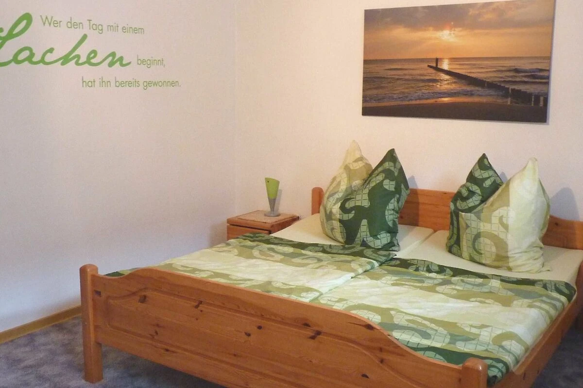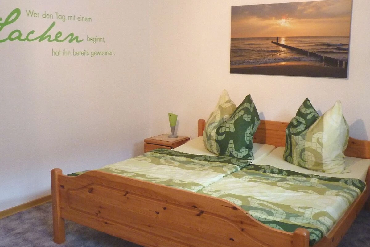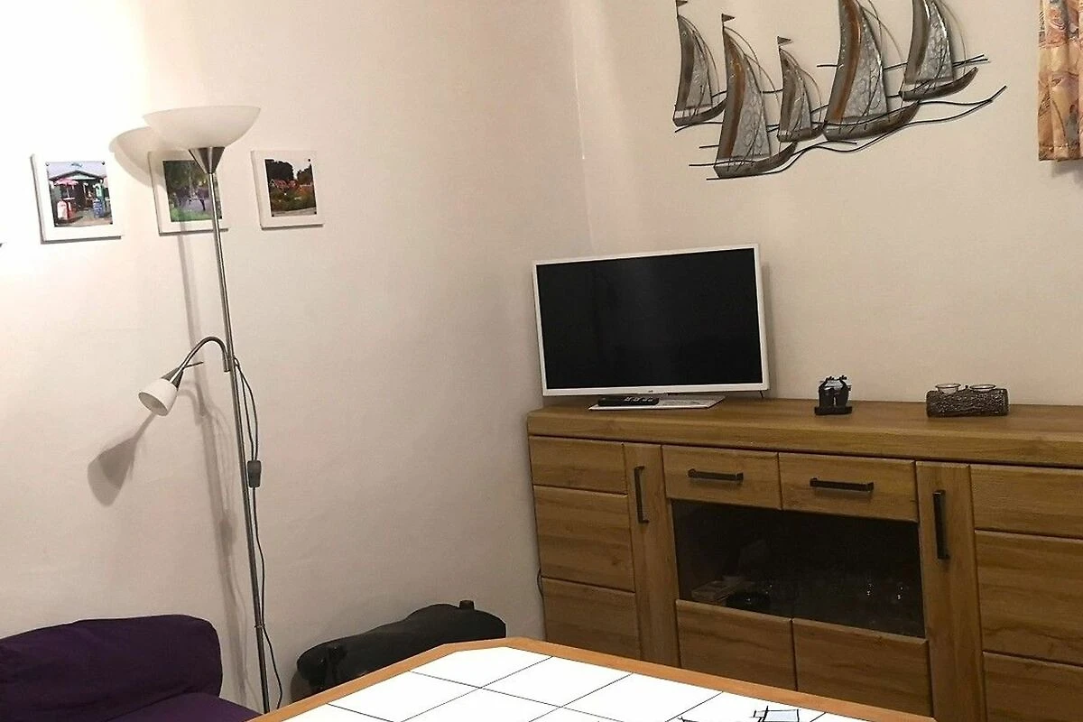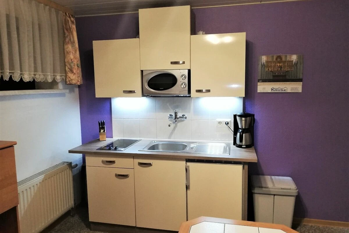 Die Ferienwohnung besteht aus einem Wohnzimmer mit Küchenzeile (Couchgarnitur, Schrankwand, Tisch, Miniküche mit Spüle, E-Herd, Kühlschrank, Kaffeemaschine, Geschirr und Hausrat, TV mit Sat-Anschluss und Radio), Schlafzimmer (Doppelbett, Rollbett, Kleiderschrank), Dusche/WC und Flur mit Garderobe. Alle Fussböden mit Teppichboden bzw. Fliesen. Zentralheizung. Ein Kinderbett ist ebenfalls vorhanden. Erstausstattung Bettwäsche inklusive Übernachtungspreis.