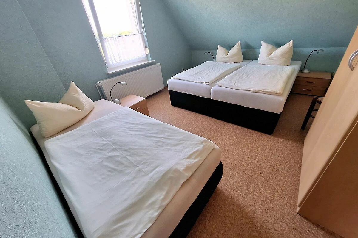 • befinden sich 3 Schlafräume ausgestattet mit Bettkastenliegen und Kleiderschränken sowie