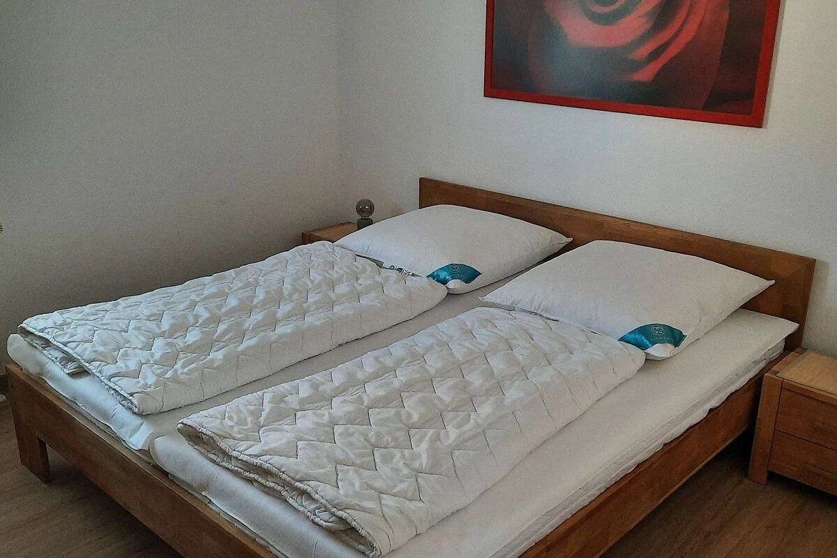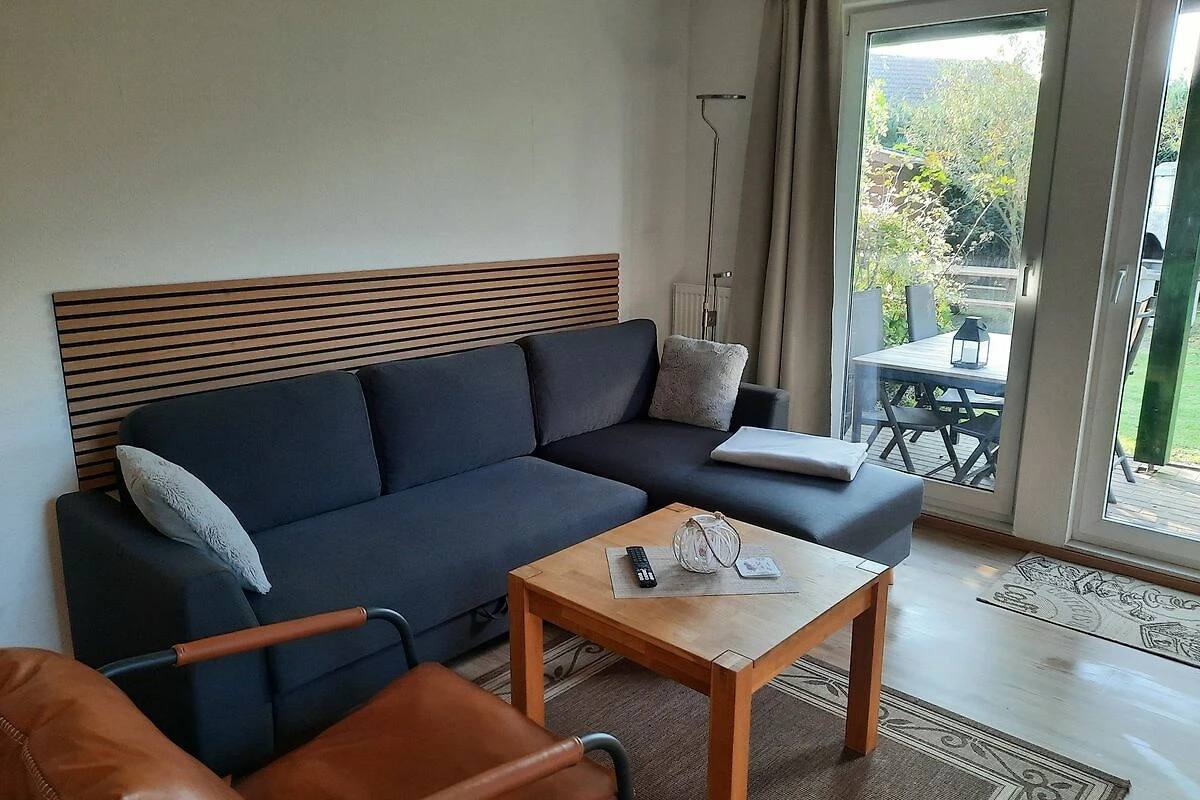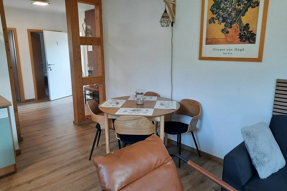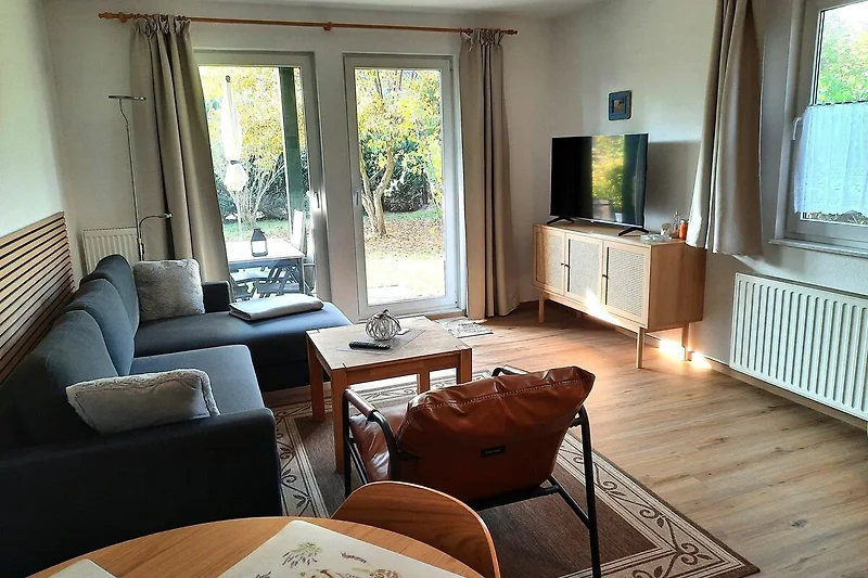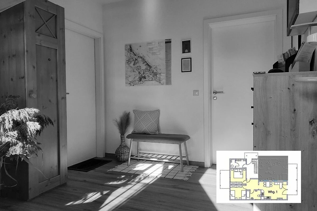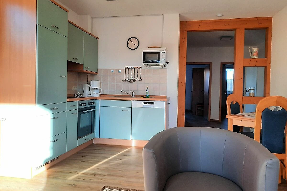 Die ca. 60qm grosse, helle 3-Raum-Ferienwohnung verfügt über einen grosszügigen Wohn-Essbereich mit gemütlicher Couch und Smart-TV, Esstisch und einer offenen Küche mit Backofen, Cerankochfeld, Kühlschrank mit Gefrierfach, Mikrowelle, Geschirrspüler, Kaffeemaschine, Wasserkocher und Toaster. Das erste Schlafzimmer ist mit einem Doppelbett und das zweite Schlafzimmer mit zwei Einzelbetten ausgestattet. Das moderne Badezimmer verfügt über eine bodengleiche Dusche, Waschbecken, WC und einen Haartrockner. W-LAN steht Ihnen kostenfrei zur Verfügung.