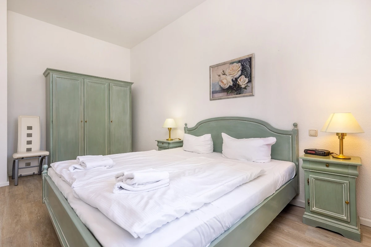 Das Schlafzimmer hat ein Doppelbett und einen großen Kleiderschrank.