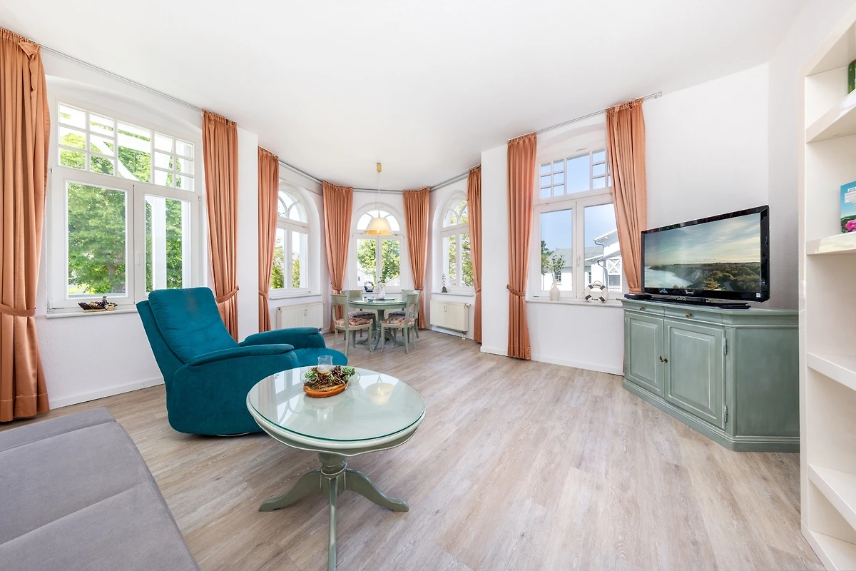 Ein großes Wohnzimmer mit 42''-Flachbild-TV (Bildschirmdiagonale 106 cm), Radio, Couch mit Schlaffunktion, kostenfreiem WLAN-Anschluss und einem schönen Essplatz im Erker erwartet Sie.