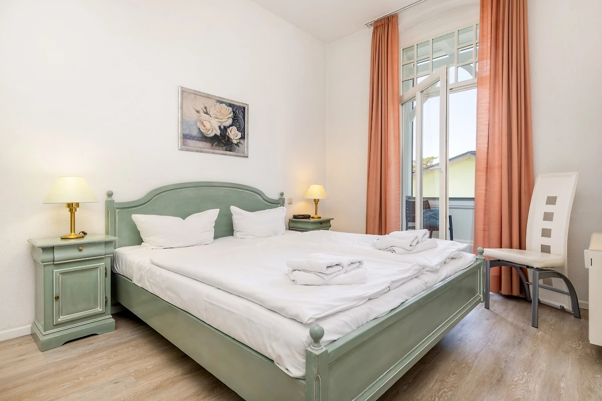 in einem großen, lichtdurchfluteten Appartement mit Erker und Balkon, nur eine halbe Minute vom Strand entfernt.
