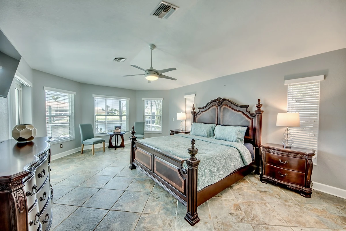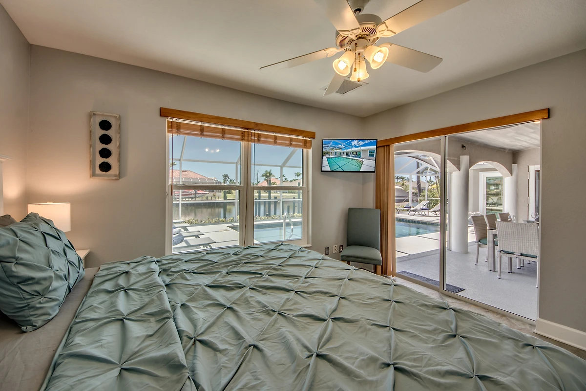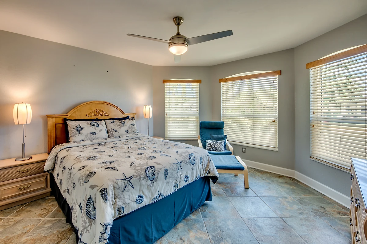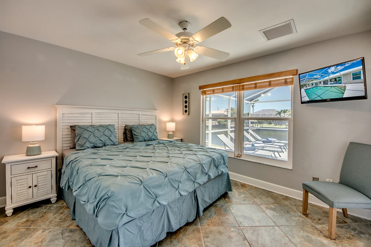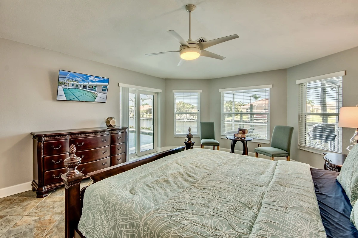 Das Hauptschlafzimmer ist geräumig und hat durch Flügeltüren Zugang zur Lanai und Fenster mit Blick auf den Kanal. Die drei weiteren Schlafzimmer teilen sich zwei Badezimmer.