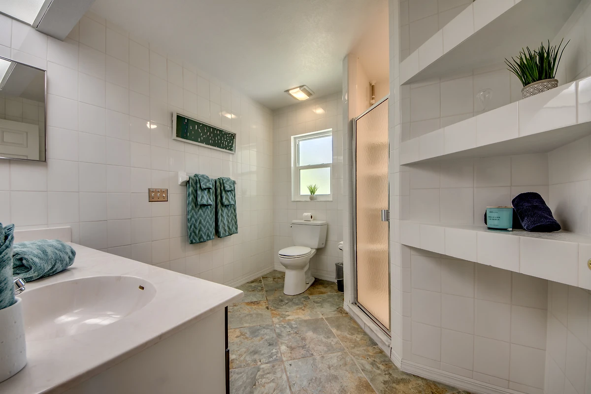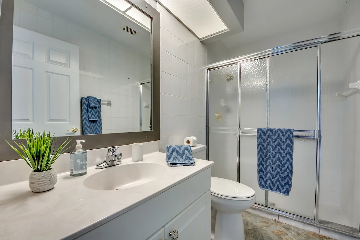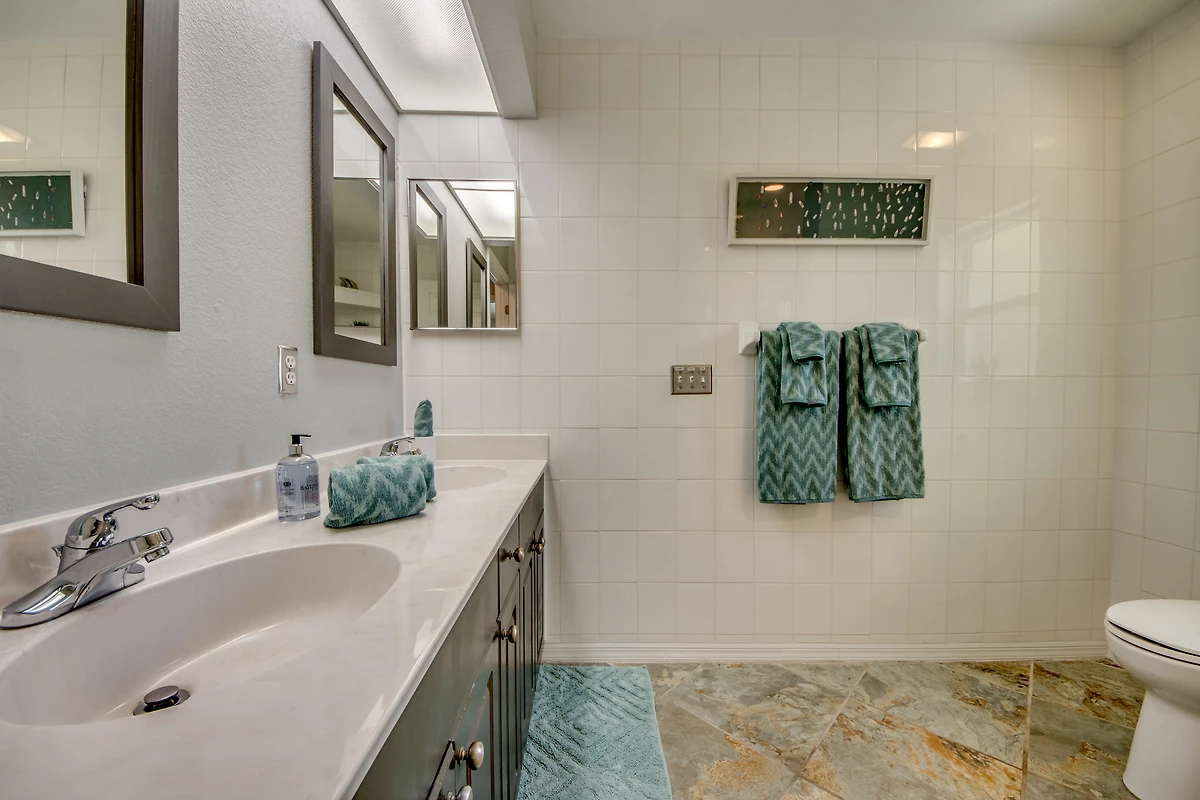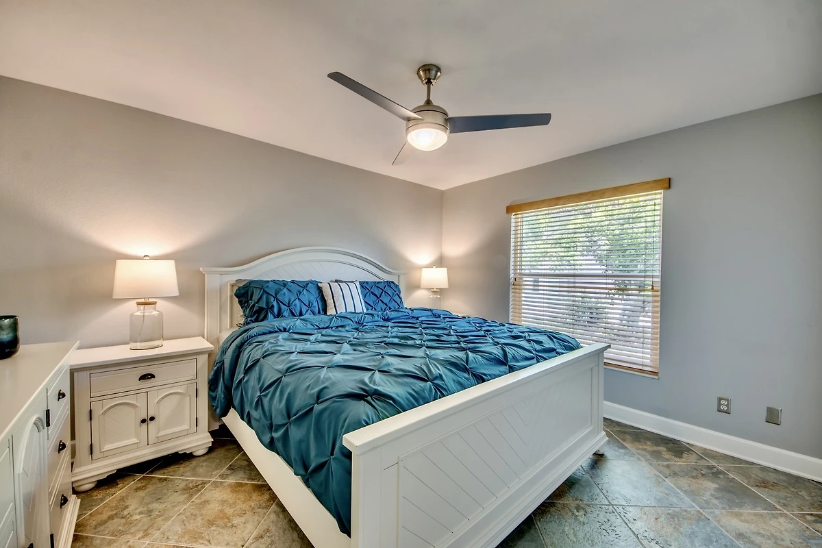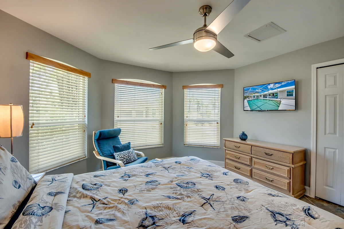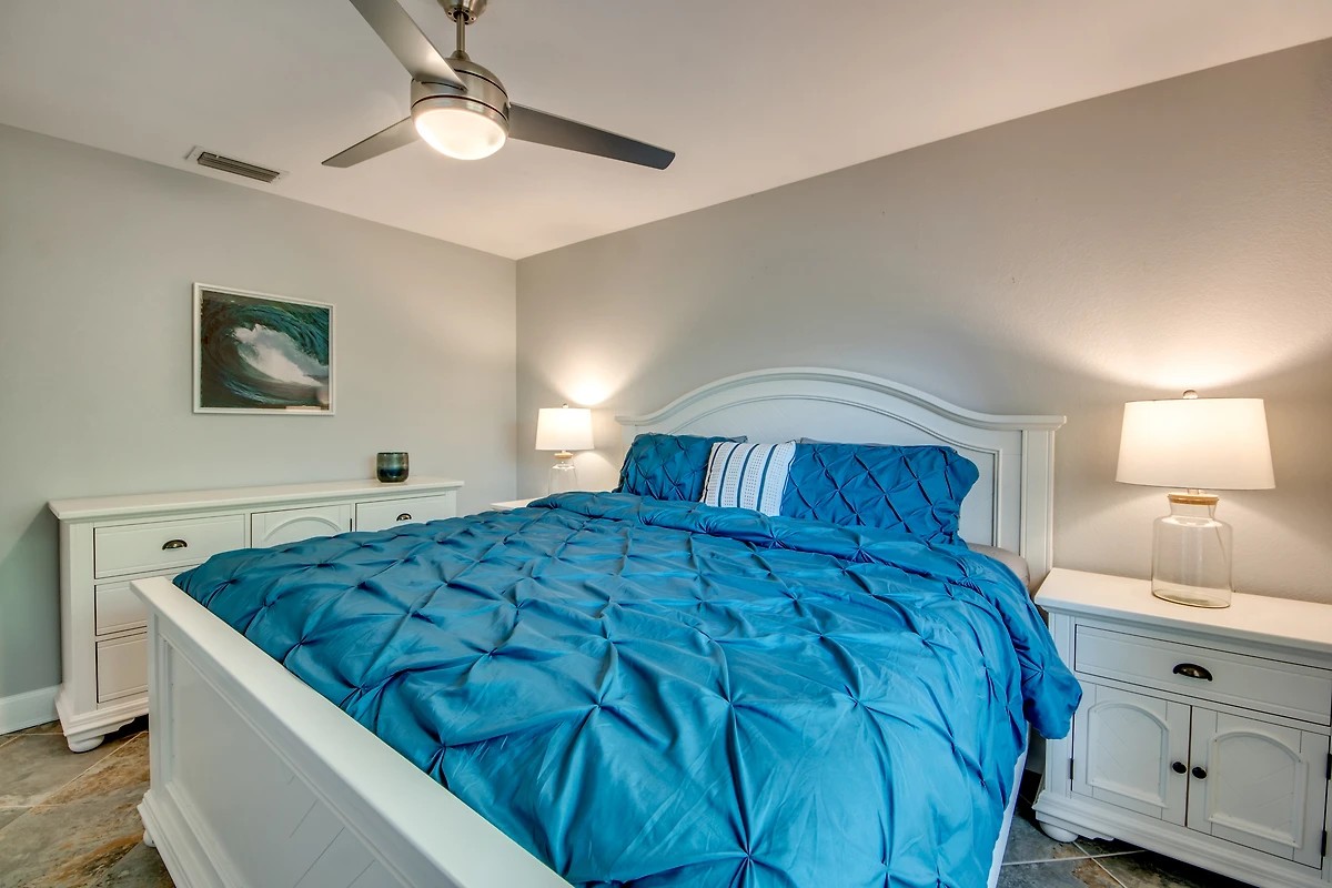 Das Hauptschlafzimmer ist geräumig und hat durch Flügeltüren Zugang zur Lanai und Fenster mit Blick auf den Kanal. Die drei weiteren Schlafzimmer teilen sich zwei Badezimmer.