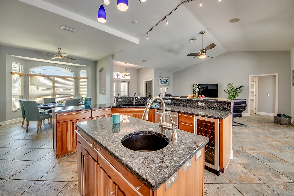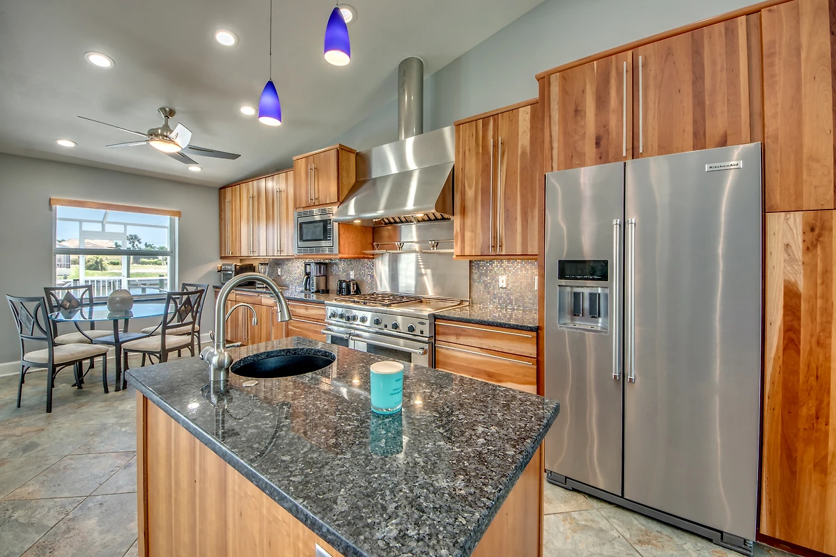 Erleben Sie entspannte Kochabende in der vollausgestatteten Küche mit professionellen Geräten. Durch die große Kücheninsel mit Spüle und Granit-Arbeitsplatten haben Sie noch mehr Platz zum Kochen.