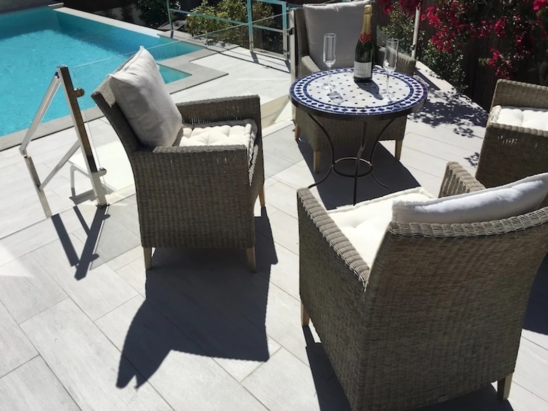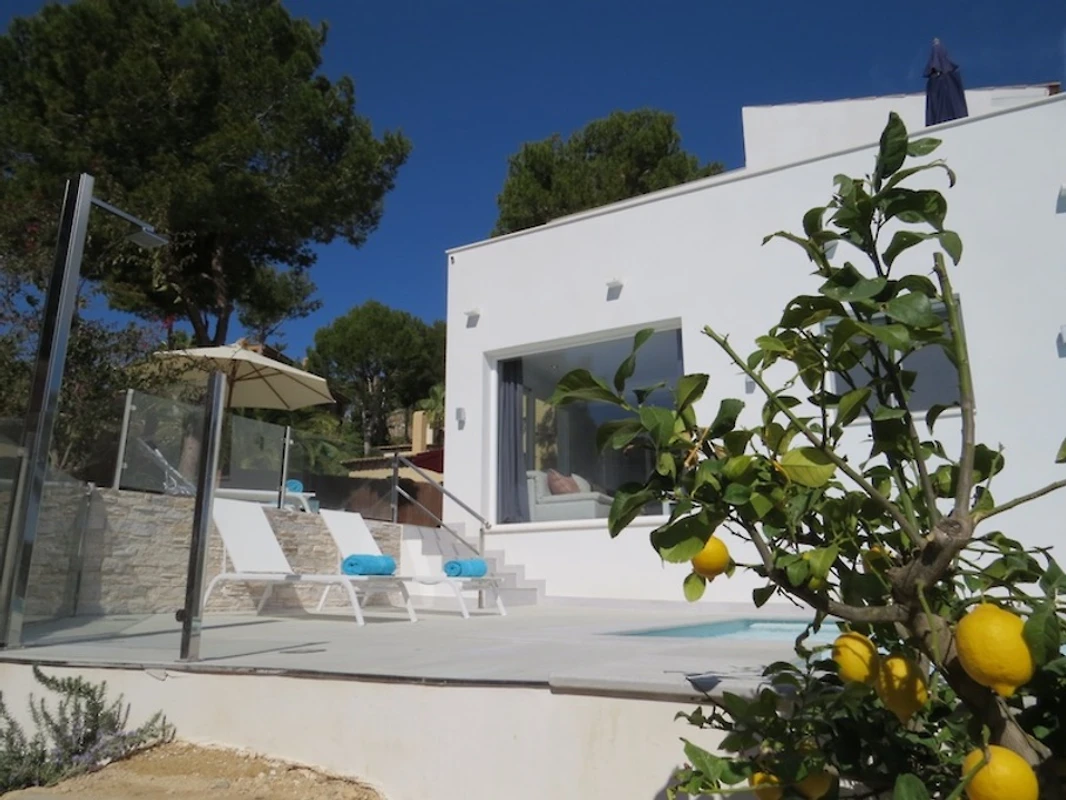 Der Außenbereich ist ein echtes Refugium für Erholungssuchende. Zwei großzügige Terrassen mit mehreren Sitzmöglichkeiten laden zum Verweilen ein – ob beim Frühstück, Lesen oder geselligen Abenden. Der gepflegte Garten mit Zitronen- Oliven- und Orangenbaum unterstreicht das mediterrane Ambiente. Mehrere große Sonnenschirme sorgen für angenehmen Schatten.