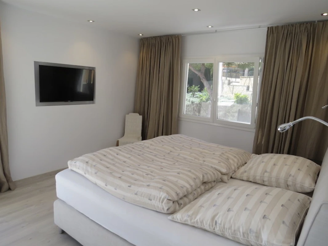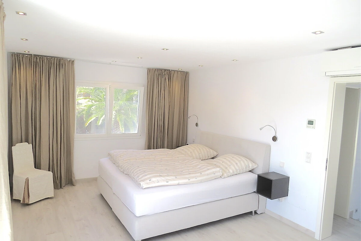Auf der zweiten Ebene befindet sich das großzügige Masterbedroom mit Kingsize-Bett und privatem Balkon, von dem aus Sie den Blick auf den Pool und die umliegende Landschaft genießen können – perfekt für ruhige Morgen oder entspannte Abende. Das moderne Badezimmer ist mit Dusche, WC und Doppelwaschbecken ausgestattet. Ein weiteres, stilvoll eingerichtetes drittes Schlafzimmer mit Boxspringbett bietet zusätzlichen Komfort.