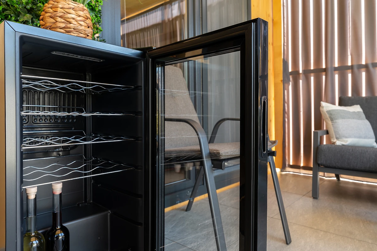 Zur Ausstattung gehören eine Waschmaschine, ein Geschirrspüler, eine Klimaanlage, ein Außen- und ein Innenkühlschrank, ein Ventilator auf der Terrasse sowie ein Fernseher im Wohnzimmer und auf der Terrasse.