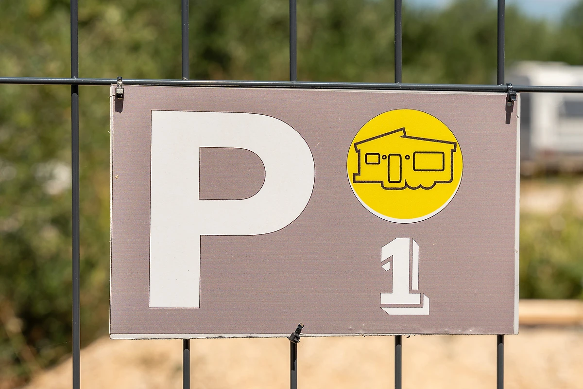 Das Mobilheim trägt die Nummer 1. Der Parkplatz befindet sich direkt neben dem Haus.