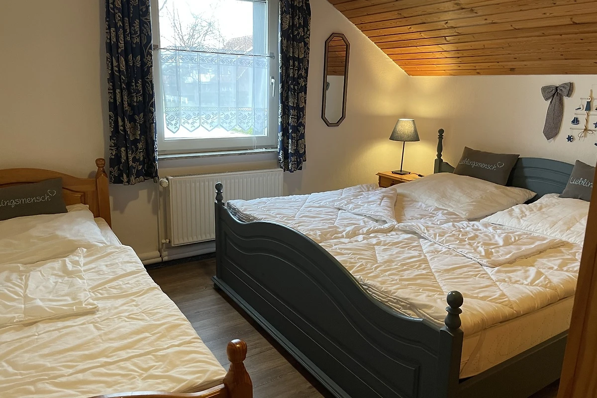 Das Schlafzimmer ist mit einem Doppelbett (180x200 cm) u. einem Einzelbett (90x200) ausgestattet. Eine weitere Person findet im Wohnraum in einem bequemen Schrankbett (90x200 cm) einen Schlafplatz.