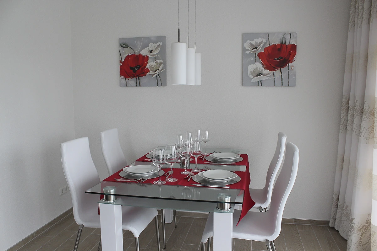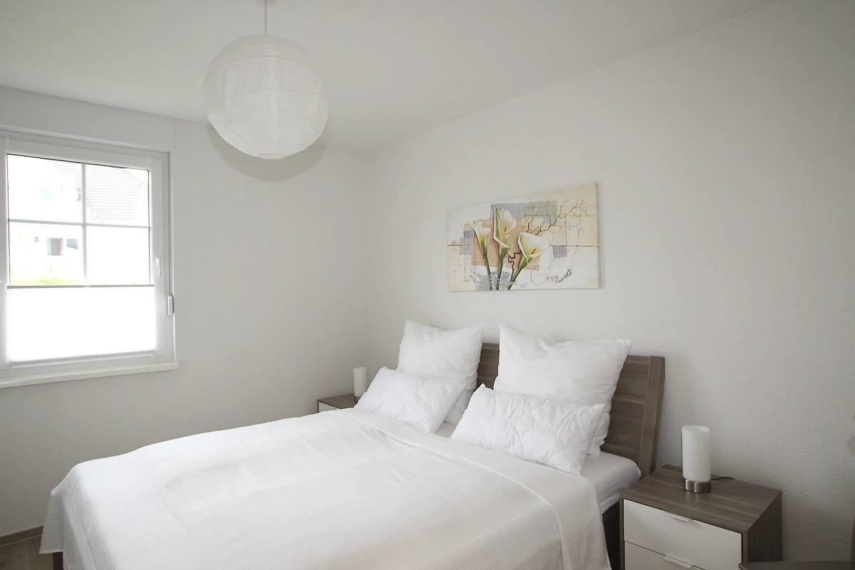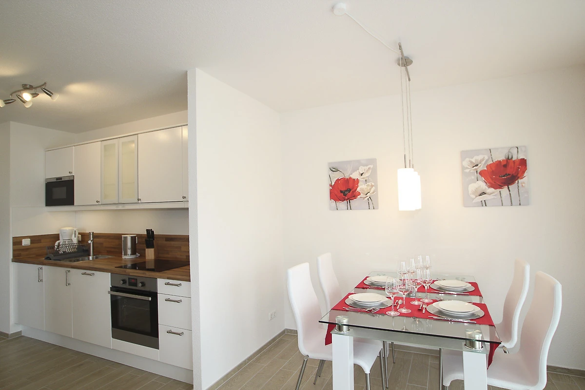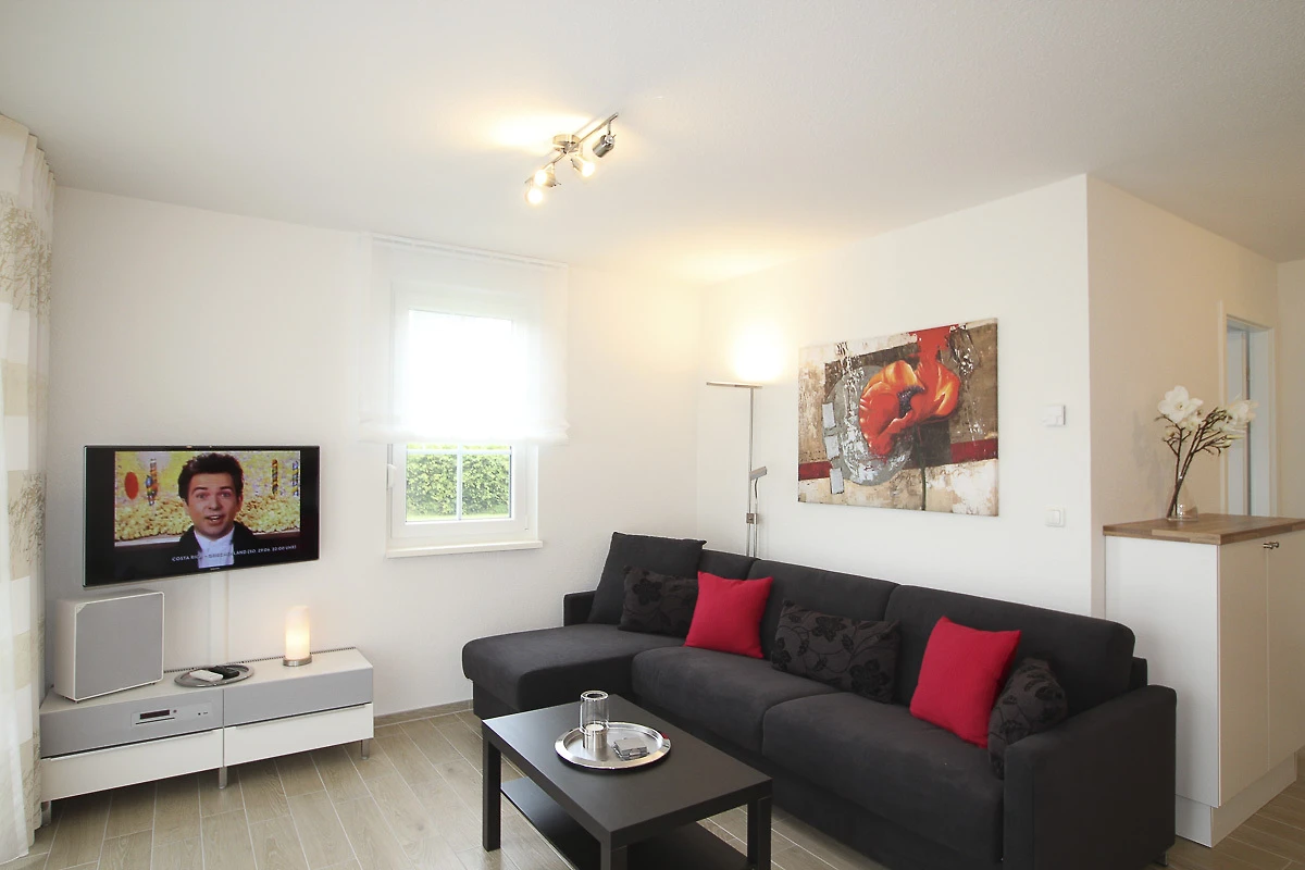 Das Wohnzimmer hat eine offene Küche, in der Sie alle modernen Geräte, incl. Geschirrspüler, Mikrowelle und Kühlschrank mit Gefrierfach vorfinden. Die Schlafcouch (mit Kaltschuammatratze) bietet Schlafgelegenheit für 2 Personen . Im Schlafzimmer steht ein Doppelbett. Die Wohnung wird über eine Fussbodenheizung beheizt und der Fussboden ist komplett gefliest, die Fenster sind mit Aussenrollläden und Insektenschutzgitter ausgestattet. Für die kleinsten Gäste stehen ein Kinderreisebett und ein Kinderhochstuhl zur Verfügung. Das Badezimmer hat ein Duschbad und erwähnenswert ist auch das Fenster im Bad. Ausserdem stehen ein Bügelbrett und ein Bügeleisen bereit. Zur Wohnung gehört ein Fahrradabstellraum (verschlossen).WLAN kann kostenfrei genutzt werden. Ein PKW Stellplatz steht den Gästen direkt vor dem Haus auf dem hauseigenen Grundstück kostenfrei zur Verfügung.