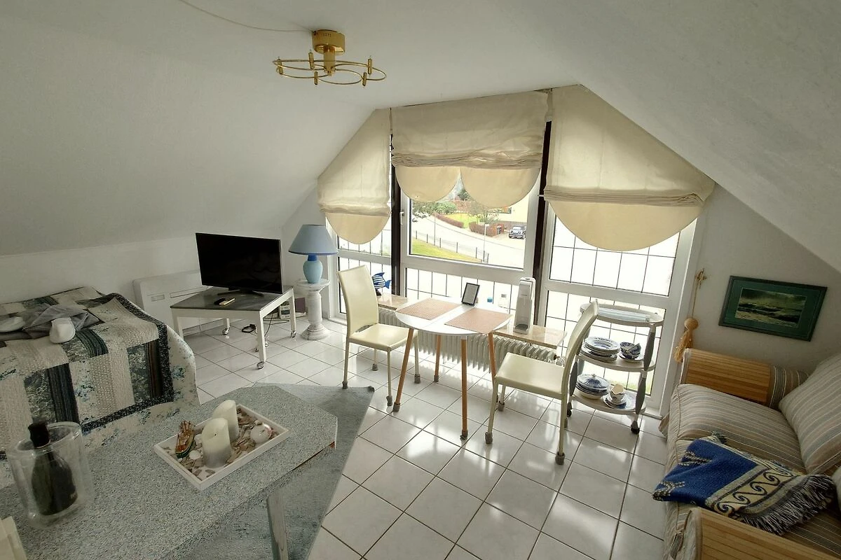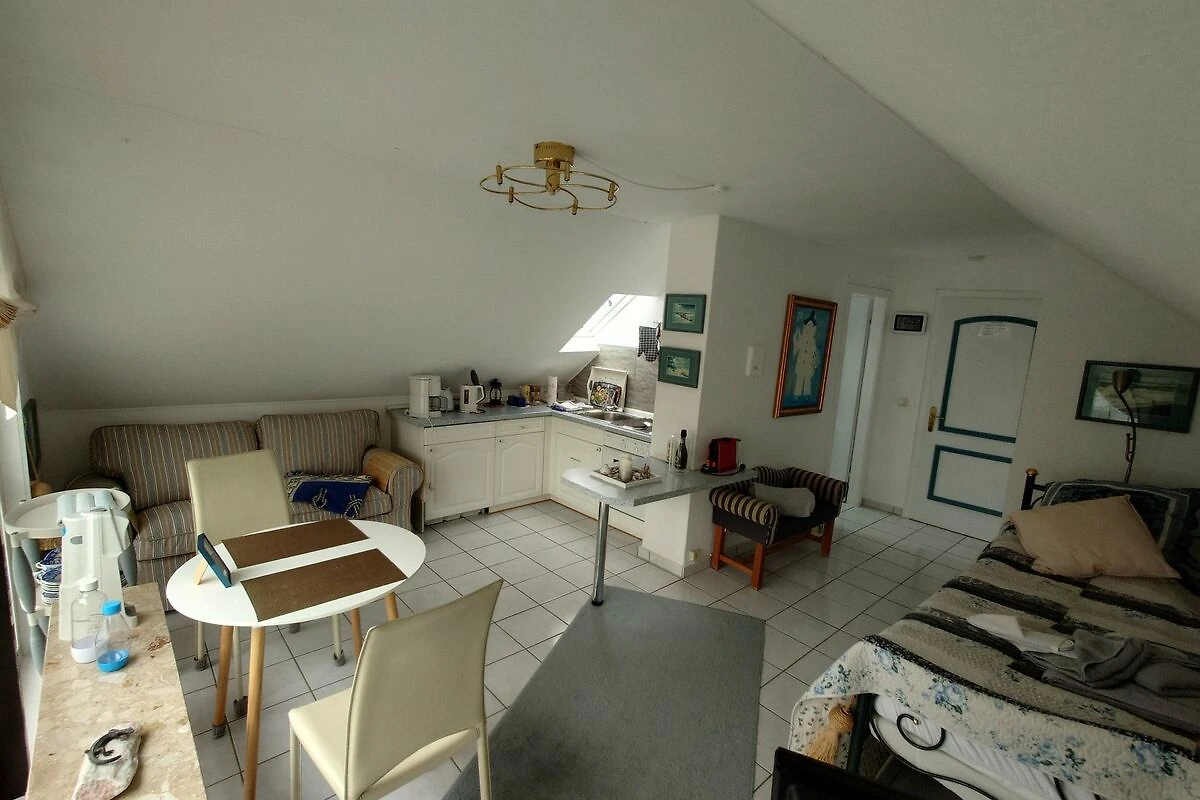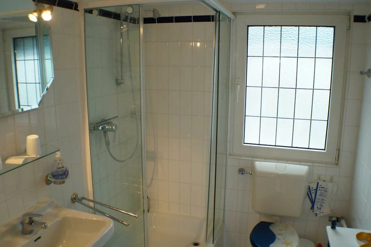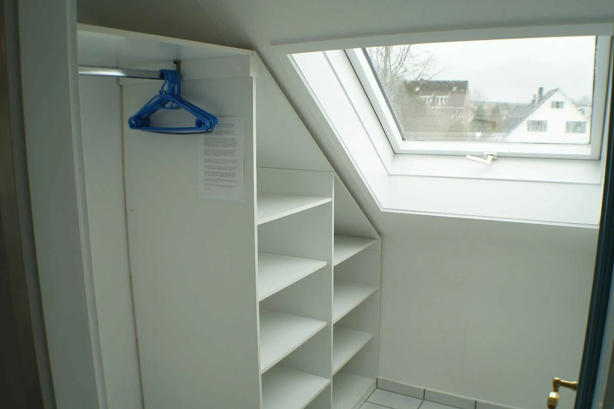 1. Obergeschoss: 1-Raum-Singlewohnung mit ca. 30 m², mit grossem Studiofenster, incl. Küchenzeile und Ess-Bar, franz. Bett (2,00 x 1,40 m, Einstiegshöhe: 60cm). Separate Dusche mit DK-Fenster, WC, stationärer Schminkspiegel, Fön. Ein begehbarer Kleiderschrank sowie Fensterlüftung. Gartenbenutzung mit Sitzplatz, Tisch und Stühlen.