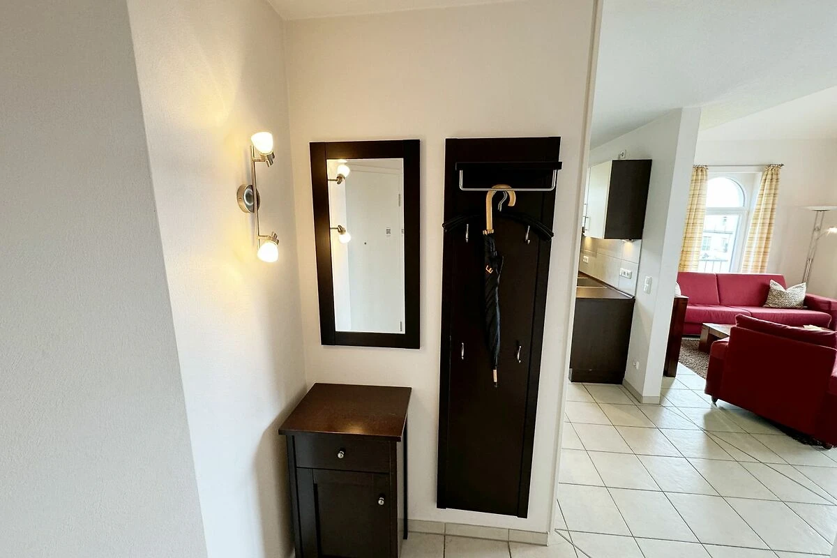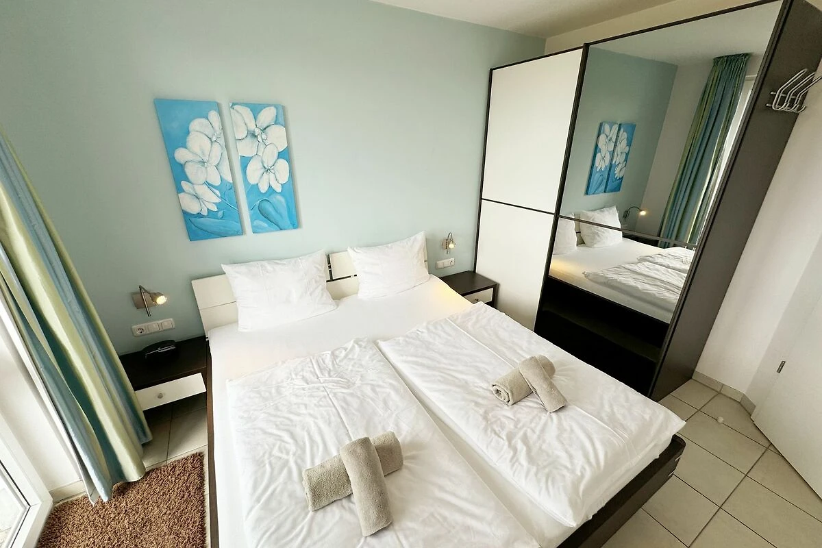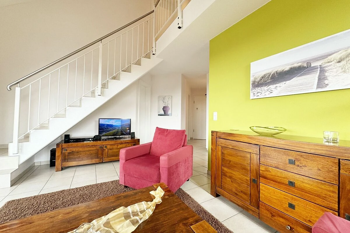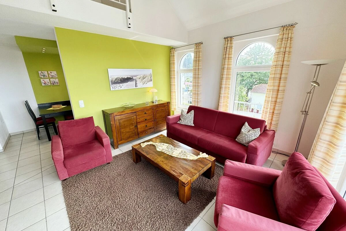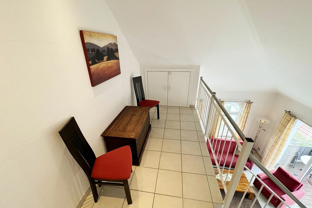 Die grosszügige und lichtdurchflutete Maisonette / Ferienwohnung Nr. 10 bietet Ihnen ausreichend Platz für max. 4 Erwachsene. Die Wohnung befindet sich im Obergeschoss und ist bequem per Fahrstuhl von der Tiefgarage aus zu erreichen. Die Wohnung ist als Nichtraucherwohnung deklariert und erstreckt sich mit Ihren 72 qm über 2 Etagen. Der sehr gemütliche eingerichtete Wohnbereich ist der Dreh- und Angelpunkt der Wohnung. Hier befindet Sie eine hochwertige Couch, 2 Sessel, Couchtisch, eine Leselampe sowie einem Smart-TV (32 Zoll) mit DVD-Player/Heimkino und Internetanschluss per WLAN (inklusive). Angrenzend an den Wohnbereich finden Sie eine moderne und komplett ausgestattete Küchenzeile mit Geschirrspüler, Mikrowelle, Kühlschrank mit Eisfach, Ceranfeld, Backofen, Kaffeemaschine, Toaster, Wasserkocher, diversen Küchenutensilien und einen Holzesstisch mit 5 Stühlen. Das 1. Schlafzimmer finden Sie auf der gleichen Ebene wie den Wohn- & Essbereich. Das Schlafzimmer verfügt über ein Doppelbett (1,80m x 2,00m) mit verstellbaren Lattenrosten, Nachtischkonsolen, Verdunklungsmöglichkeit und grossem Kleiderschrank mit Spiegel. In dem 1. Bad finden Sie eine Dusche, WC, Waschtisch, Kosmetikspiegel, Fön, Fussbodenheizung und einen Handtuchtrockner für Ihren alltäglichen Gebrauch, wieder. Um Ihren Urlaubstag in Ruhe ausklingen zu lassen, erreichen Sie vom Wohnbereich den begehbaren Süd-Westbalkon mit herrlichem Blick auf das Ostseebad Sellin. Durch die im Wohnbereich vorhandene Treppe gelangen Sie in das 2. Schlafzimmer, wo Sie ein Doppelbett (1,80m x 2,00m) mit verstellbaren Lattenrosten, Nachtischkonsolen, Verdunklungsmöglichkeit, Smart-TV und grossem Kleiderschrank mit Spiegel wiederfinden. Angrenzend befindet sich das 2. Bad mit Dusche, WC, Waschtisch, Handtuchtrockner und einer Fussbodenheizung. Im Gemeinschafskeller können Sie gegen einen Aufpreis die gemeinschaftliche Waschmaschine und den Trockner nutzen. Die Wertmarken können Sie auf Nachfrage während Ihres Urlaubes erwerben. Die Erstausstattung eines Wäschepaketes (komplette Bettwäsche, 1 Duschhandtuch, 1 kleines Handtuch) können Sie bis 14 Tage vor Anreise gegen einen Aufpreis dazu buchen oder durch eigene ergänzen. Ab 2 gebuchten Paketen erhalten Sie einmalig 1 Geschirrhandtuch und 1 Duschvorleger hinzu. Ein eigener Pkw-Stellplatz Nr. 10 und ein Fahrradraum gehören zur Wohnung und befinden sich in der hauseigenen Tiefgarage (Einfahrtshöhe 2,10 m). Haustiere sind in der Wohnung nicht erlaubt.