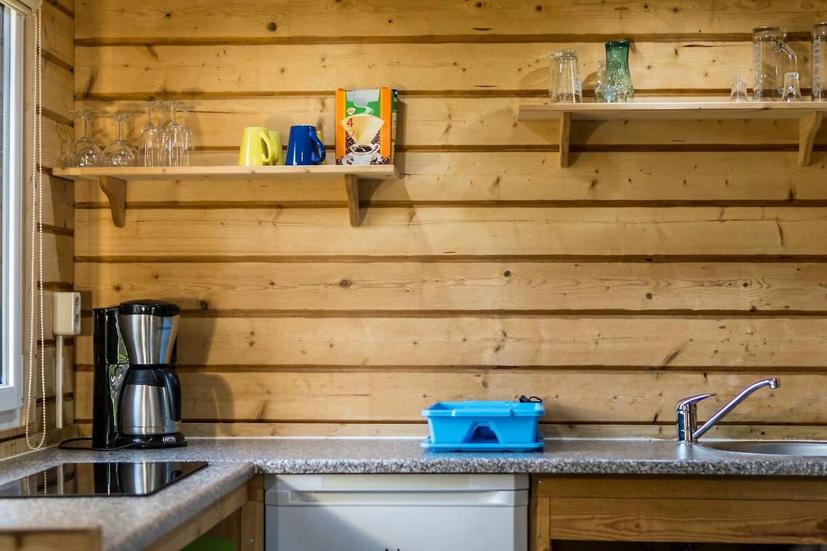 Die Küchen ist ausgestattet mit Ceran-Kochplatten, Abwaschbecken, Kaffeemaschine, Toaster (auf Nachfrage), Besteck, Geschirr, Töpfen und Pfannen.