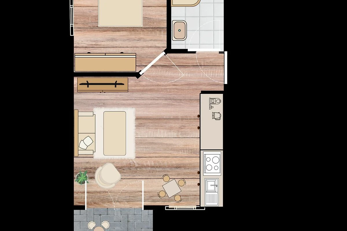 Die modern gestaltete Ferienwohnung im Erdgeschoss hat einen offenen Wohnbereich mit Küchenzeile und Essbereich, ein Schlafzimmer mit Doppelbett und eine Terrasse. Die funktionale Küchenzeile ist mit 2-Platten-Ceranfeld, Geschirrspüler, Kühlschrank mit Gefrierfach, Mikrowelle, Kaffeemaschine und div. Geschirr ausgestattet. Ein Bad mit ebenerdiger Dusche, Waschtisch und WC komplettieren den guten Gesamteindruck der Wohnung.