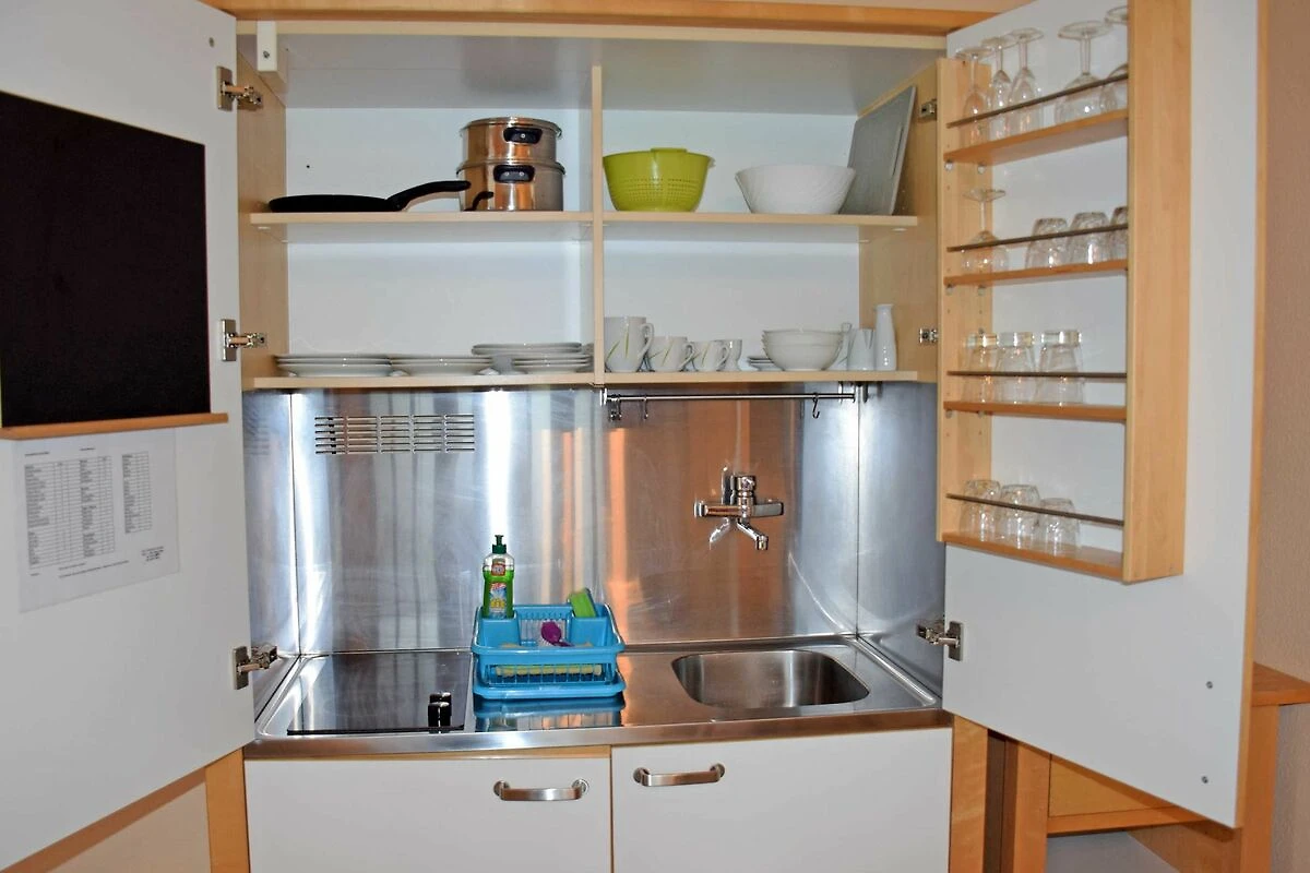 Sie haben hier die Möglichkeit den Sonnenaufgang jeden Morgen zu erleben. Im Wohn-/Schlafraum befinden sich eine Sitzgelegenheit mit Tisch und ein modernes Flachbild-TV-Gerät sowie ein bequemes Doppelbett mit Nachttischen und Leselampen. Hier steht auch Esstisch mit Sitzgelegenheiten. Die moderne Küchenzeile ist mit einem Herd, Mikrowelle, Wasserkocher, Kaffeemaschine, Toaster und Kühlschrank komplett ausgestattet. Ein kleines Kinderreisebett und ein Hochstuhl können auf Wunsch kostenlos bereit gestellt werden. Bei Ihrer Anreise sind die Betten bereits mit Bettwäsche aufbezogen, Handtücher können gegen eine Gebühr zugebucht werden. Das Bad ist mit Dusche, Handtuchwärmer, WC und Waschtisch ausgestattet und verfügt über Tageslicht. Zum dieser Ferienwohnung gehört eine Gemeinschaftsterrasse mit Gartenmöbeln und Grillmöglichkeit.
