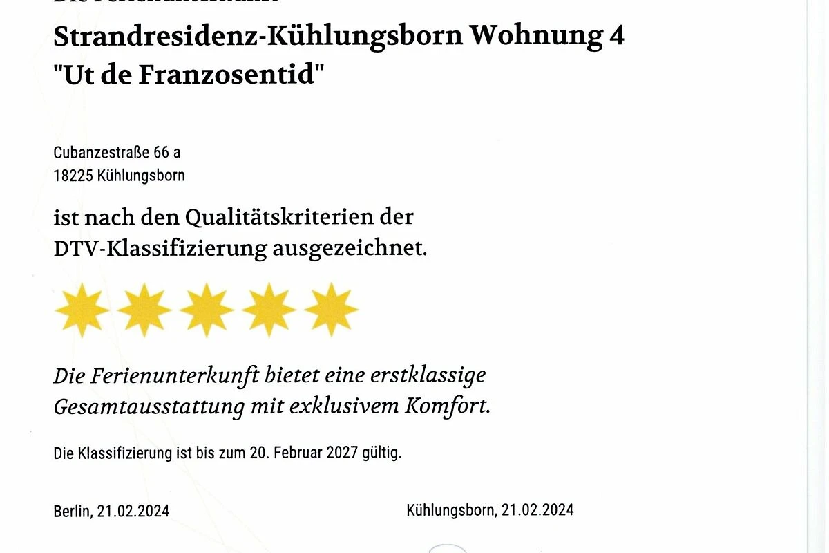 Die 7 Wohnungen gehören zu den Flaggschiffen der vom DTV zertifizierten deutschen Ferienwohnungen mit 1.216 bis zu 1.331 vergebenen Punkten. 5 Sterne gibt es ab 900 Punkte.