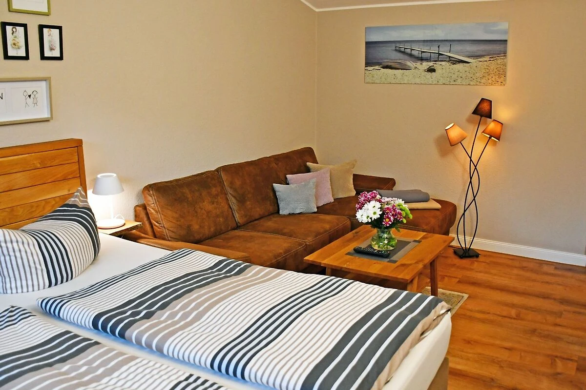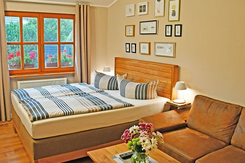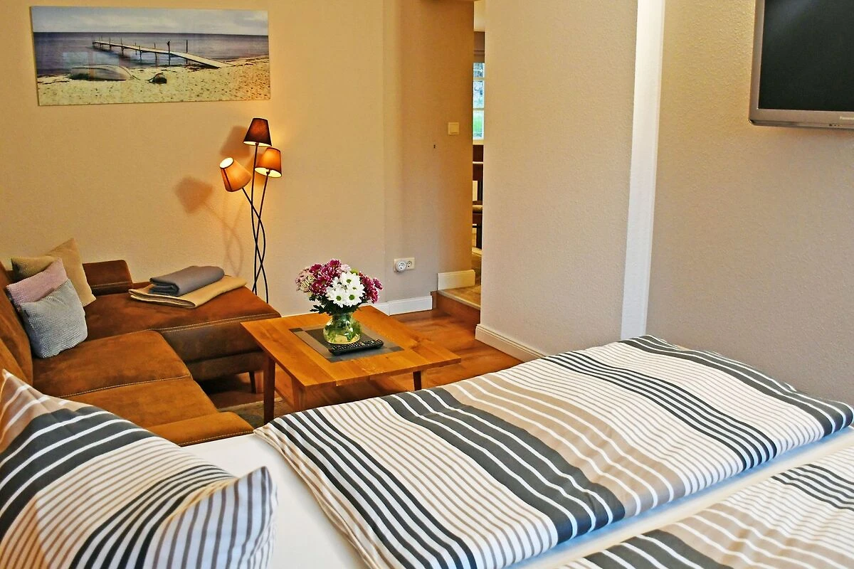 Unsere Ferienwohnung (31 qm, 1 Wohn- /Schlafzimmer, sep. Küche, Bad/WC, WLAN, max. 2 Erw.) befindet sich in einem Einfamilienhaus und liegt sehr ruhig und naturnah direkt am Beginn der Granitz, in der man wunderschön wandern und sich entspannen kann.