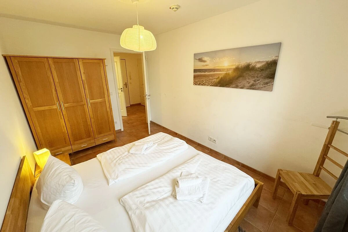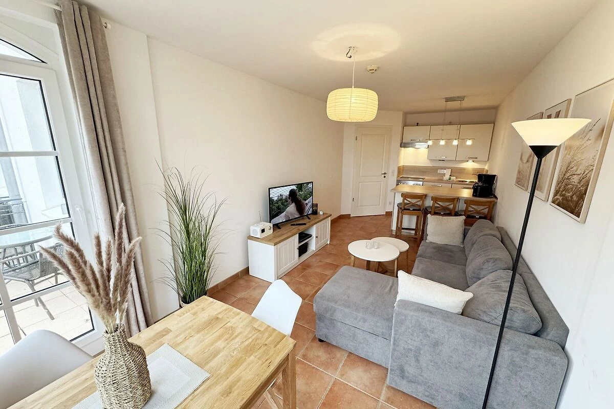 Die Nichtraucherferienwohnung „Ostseewelle“ (A 1.18) befindet sich in der Meeresblickanlage in der 1. Etage und bietet Ihnen ausreichend Platz für 2- 3 Personen. Mit Ihren ca. 42 qm wird alles abgedeckt was Sie für Ihren Urlaub und Ihre Erholung brauchen. Der helle Wohnbereich mit Zugang auf den bestuhlten Balkon, mit Blickrichtung zur Ostsee ist freundlich eingerichtet. Die integrierte Küchenzeile verfügt über einen Geschirrspüler, Backofen mit 4 Zonen-Ceranfeld, Kühlschrank mit 3-Sterne Eisfach, Kaffeemaschine, Toaster, Wasserkocher sowie diverse Küchenutensilien. Angrenzend haben Sie hier Ihren Essbereich mit 3 dazugehörigen Barhockern, die Ihnen ein gemütliches Ambiente bieten. Die Eckcouch mit Schlaffunktion für die 3. Person (1,20m x 1,95m) passt sich mit dem Sideboard dem Smart-TV + DVD-Player und der Mini-Stereo-Anlage mit DAB-Radio perfekt an. Das Schlafzimmer mit massiven Holzmöbeln vom Doppelbett (1,80 m x 2,00 m), Kleiderschrank bis hin zu Nachtischkonsolen bietet Ihnen einen angenehmen Schlaf und Wohlbefinden. Das geflieste Bad mit Dusche, Waschtisch, Kosmetikspiegel, Fön und WC runden den Raum ab. Auf einen Internetanschluss WLAN müssen Sie im Urlaub nicht verzichten. Dieser ist für Sie inklusive. Ein eigener PKW-Stellplatz (Nr.43, Einfahrtshöhe 2,00m) befindet sich in der Tiefgarage des Hauses. Im Keller des Hauses haben Sie die Möglichkeit eine Waschmaschine/Trockner gegen Gebühr zu nutzen. Mit dem Fahrstuhl des Hauses A gelangen sie in das Untergeschoss der Meeresblickanlage, wo Sie ein grosszügiger und heller Wellnessbereich erwartet. Hier können sie in einem Pool kleine Bahnen schwimmen, in 2 Saunen Ihren Kreislauf in Schwung bringen, in einem dazugehörigen Ruheraum Ihren Körper wieder beruhigen, in einer Schneckendusche sowie weiteren Duschen das kühle Nass geniessen und auf einer Aussenterrasse mit Aussendusche die frische Luft einatmen. Die Erstausstattung eines Wäschepaketes (komplette Bettwäsche, 1 Duschhandtuch, 2 kleine Handtücher) können Sie bis 14 Tage vor Anreise gegen einen Aufpreis dazu buchen oder durch eigene ergänzen. Ab 2 gebuchten Paketen erhalten Sie einmalig 1 Geschirrhandtuch und 1 Duschvorleger hinzu.