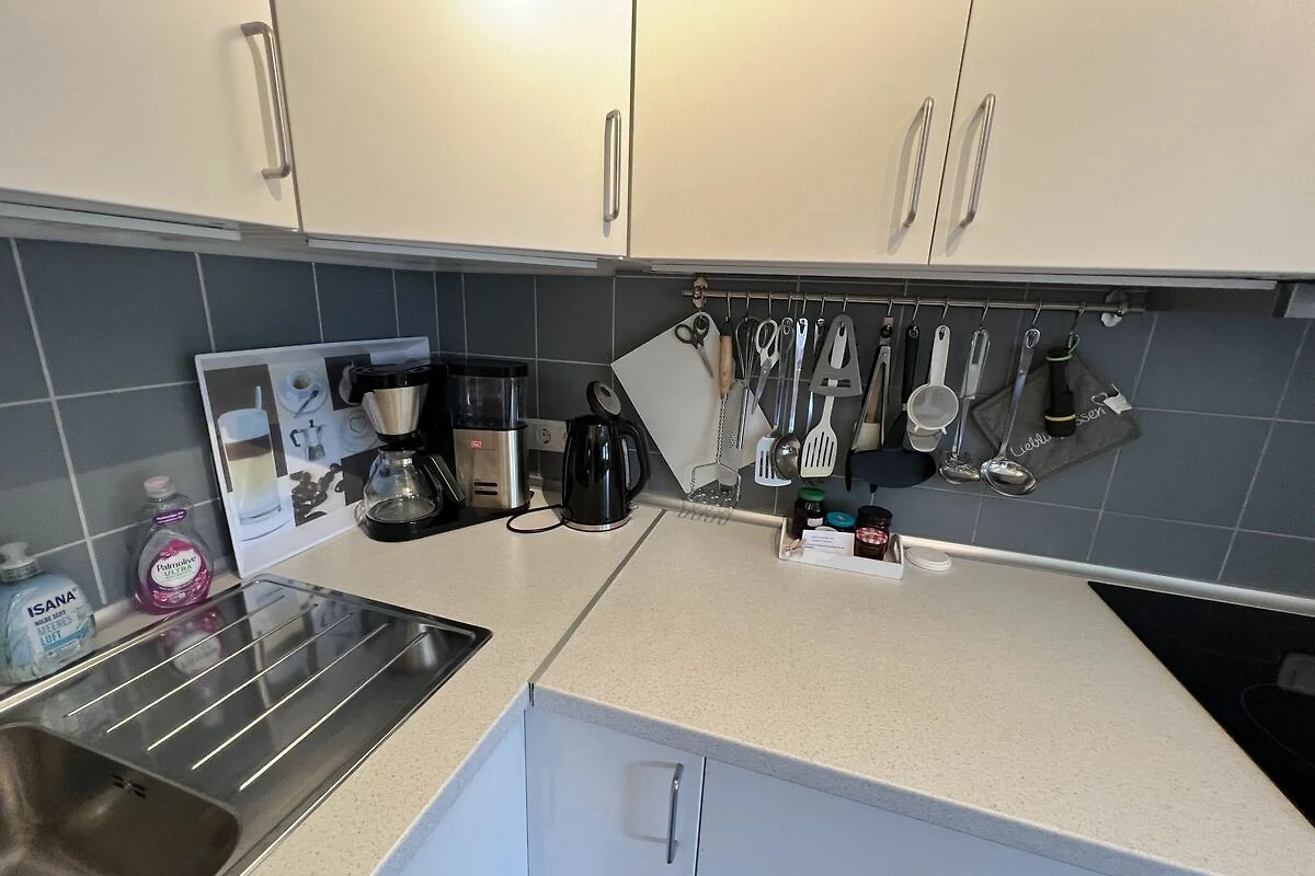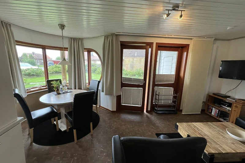 Die Ferienwohnung hat im Wohnbereich eine integrierte Küchenzeile und eine Essecke mit Esstisch und 4 Stühlen.