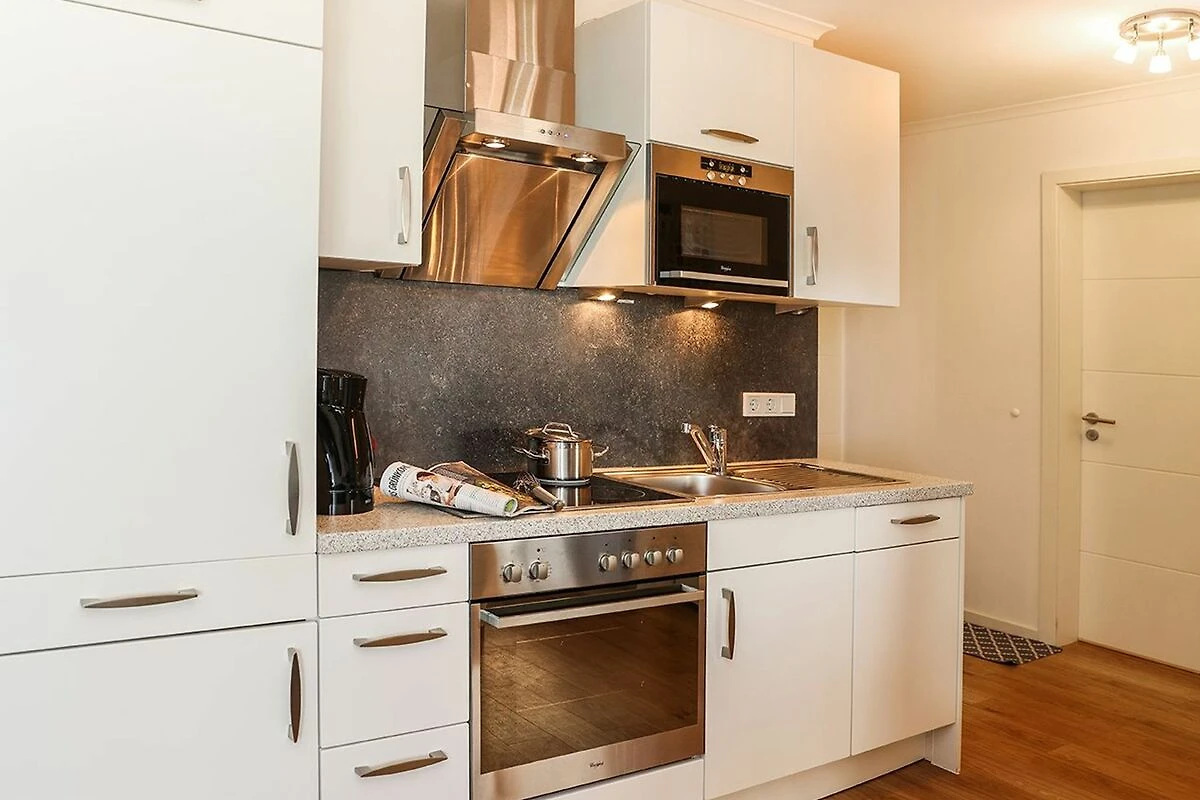 Die moderne offene Küche hat einen Geschirrspüler, einen Backofen, eine Mikrowelle, einen Kühlschrank mit Gefrierfach und ist darüber hinaus mit allem ausgerüstet, was Sie für Ihren Aufenthalt benötigen.