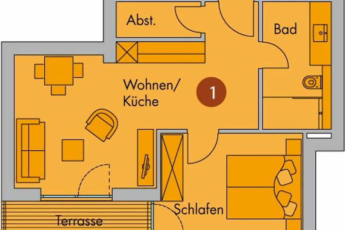 Das Herzstück des gemütlichen Wohn- und Essbereichs ist die einladende Eckcouch. Sie bietet ausgezogen Schlafmöglichkeiten für maximal zwei Erwachsene (140 cm Breite). Zur Ausstattung gehört zudem ein grosser Smart-TV. Am schönen Echtholztisch mit vier Armlehnstühlen können Sie in Ruhe Ihre Mahlzeiten geniessen oder eine entspannte Zeit mit der Familie bei fröhlichen Gesprächen und Spieleabenden verbringen. Auf dem herrlichen Balkon in Ost-Ausrichtung befindet sich ein weiterer Essbereich für vier Personen.