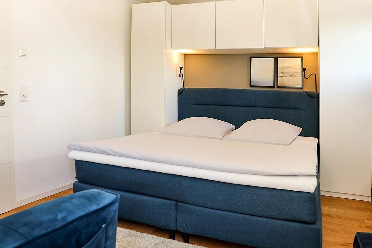 Im Schlafzimmer bietet das King-Size-Boxspringbett mit einer Grösse von 180 x 200 cm (durchgehende Matratze) Komfort wie im Hotel. Dazu stehen Ihnen ein zweiter Fernseher sowie genügend Stauraum zur Verfügung.