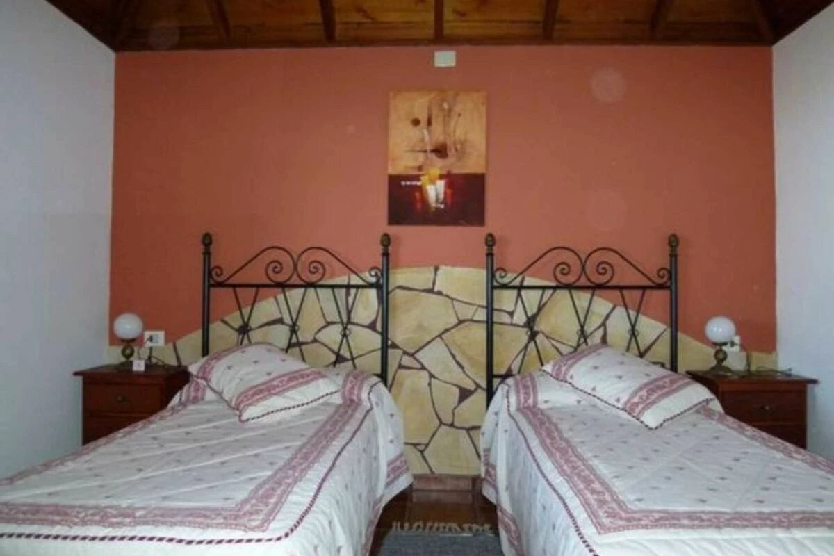 Das Schlafzimmer wurde in warmen Tönen gehalten. Auch hier wird der Gesamtstil des Hauses weitergeführt. Ein schöner Rundbogen in Steinoptik schmückt die Wand an der die zwei Einzelbetten stehen. Durch das Schlafzimmerfenster hat man einen schönen Blick in den Garten und auf die Terrasse.