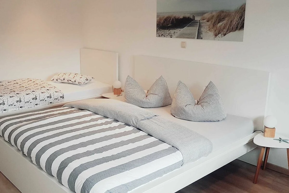 Dieses komfortable 3-Bettzimmer in der oberen Etage bietet Ihnen alles, was Sie für einen erholsamen Aufenthalt benötigen. Das Zimmer ist ausgestattet mit einem Doppelbett, einem Einzelbett, einem geräumigen Kleiderschrank, einem Fernseher sowie einem Tisch mit drei bequemen Sesseln.