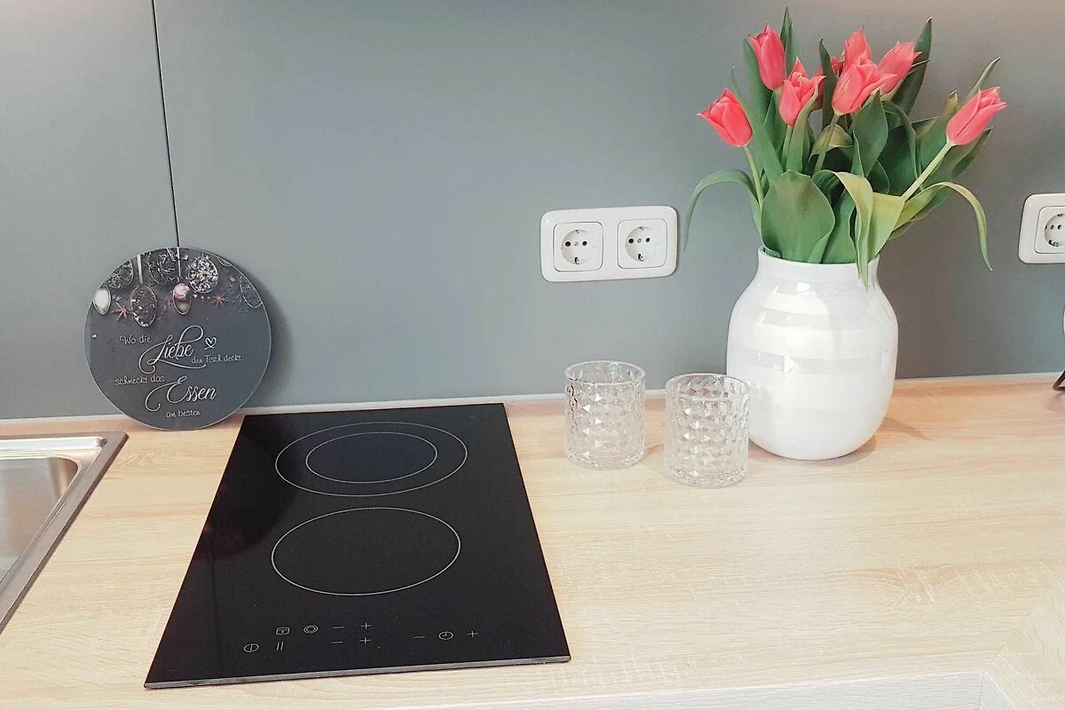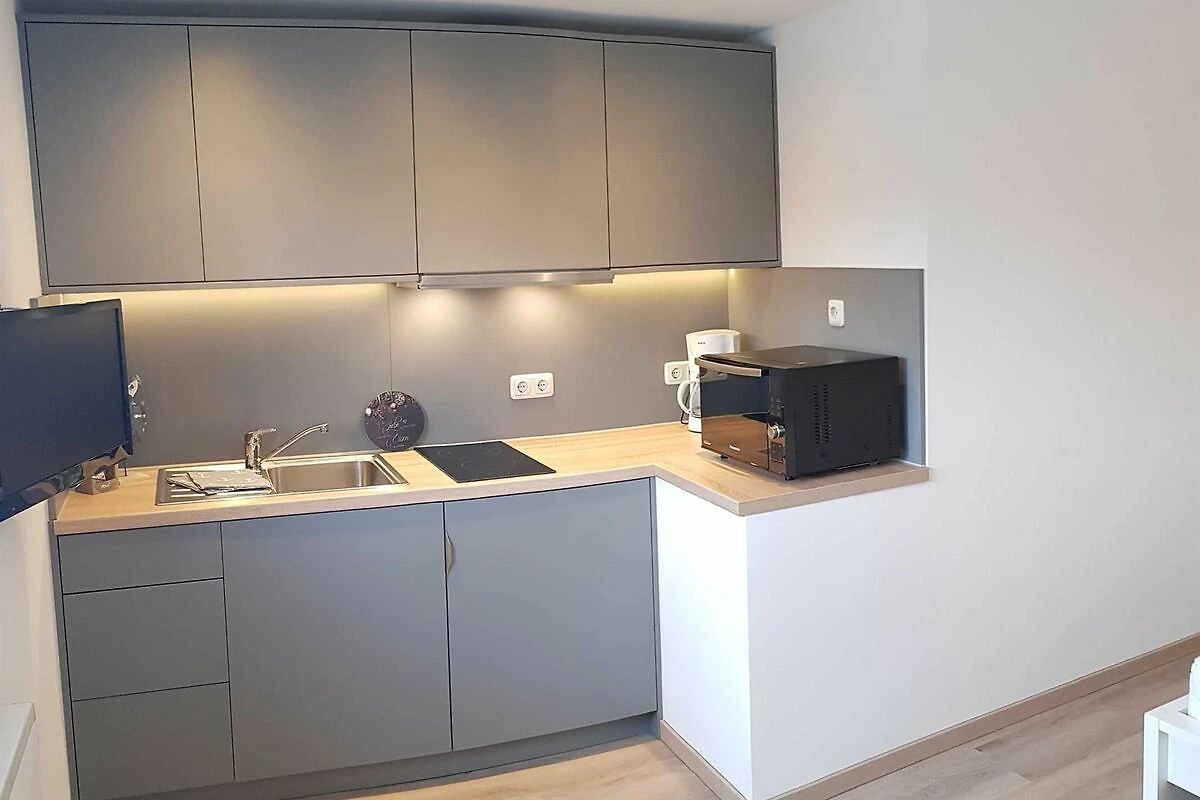 In der kleinen Küchenzeile finden Sie eine Mikrowelle, einen Toaster, eine Kaffeemaschine und einen Wasserkocher, um einfache Mahlzeiten zuzubereiten. Das Bad mit WC befindet sich im Erdgeschoss der Ferienwohnung.