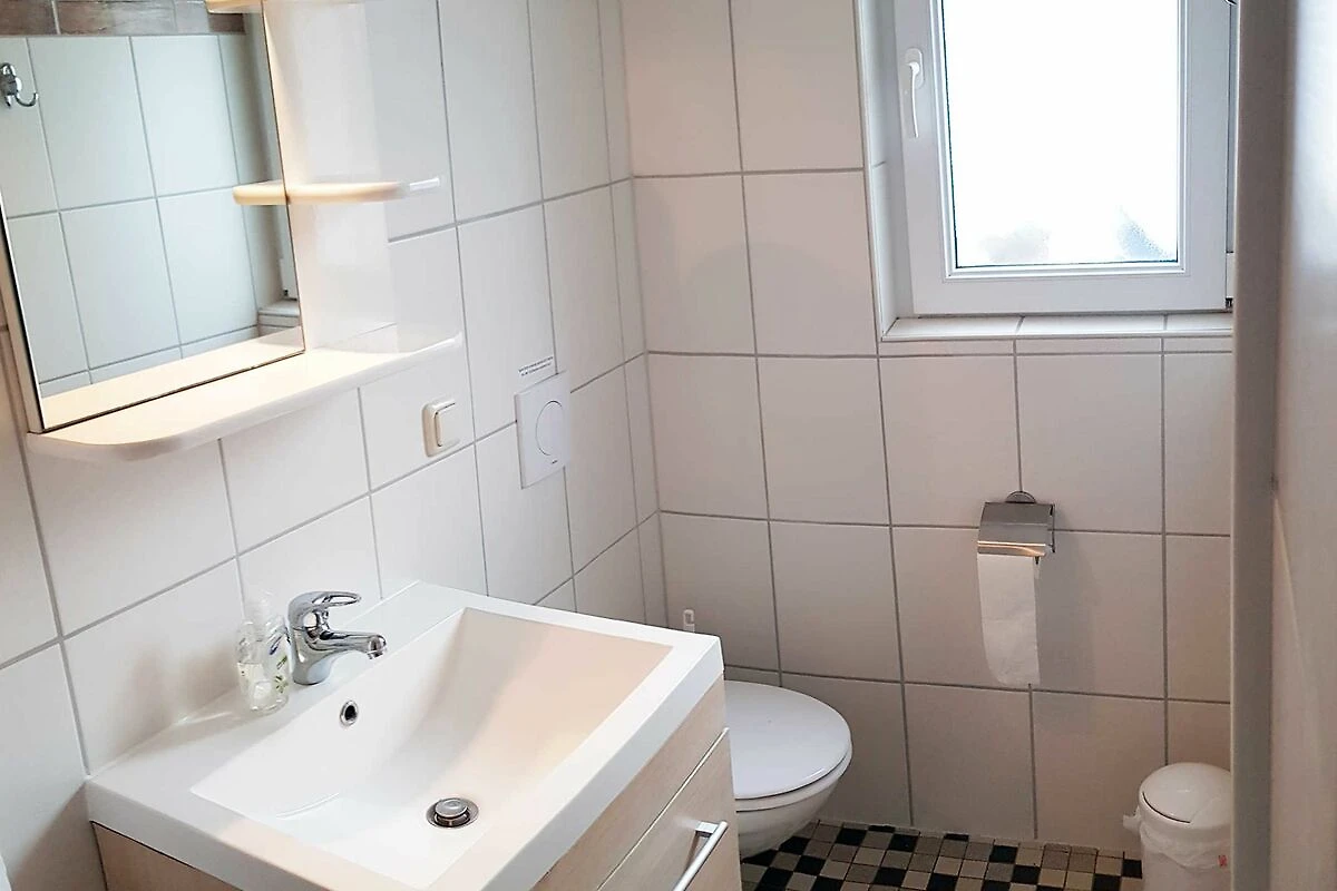 Das Bad mit WC und Dusche befindet sich im Erdgeschoss der Ferienwohnung.