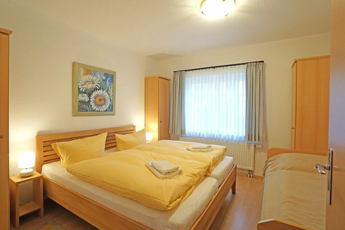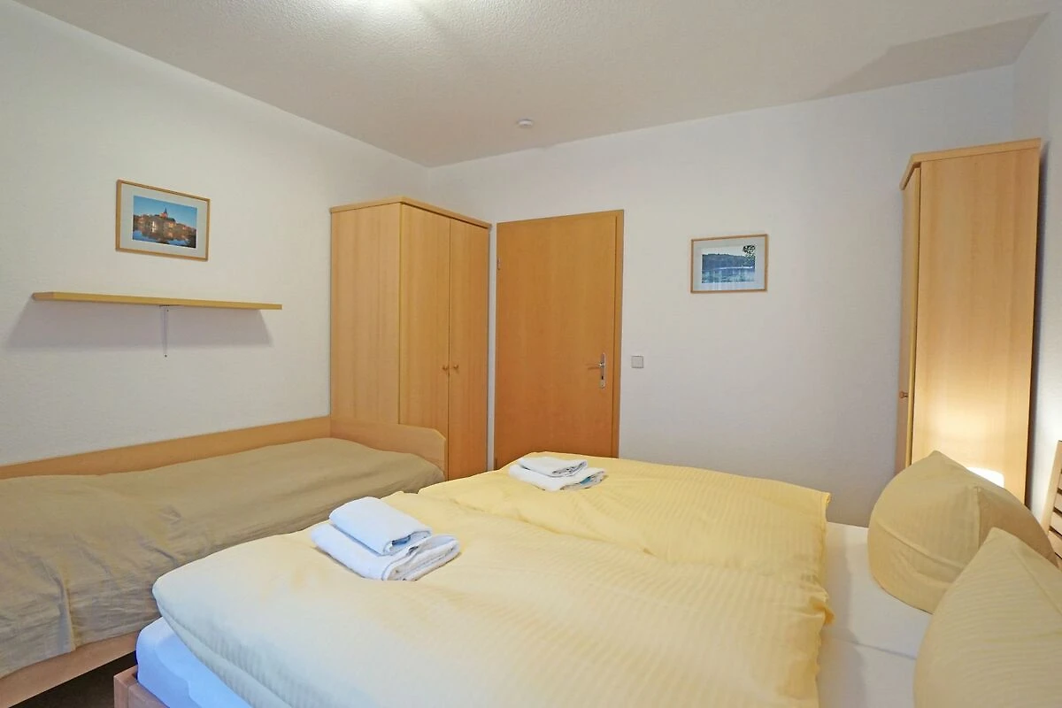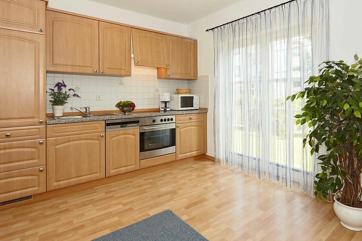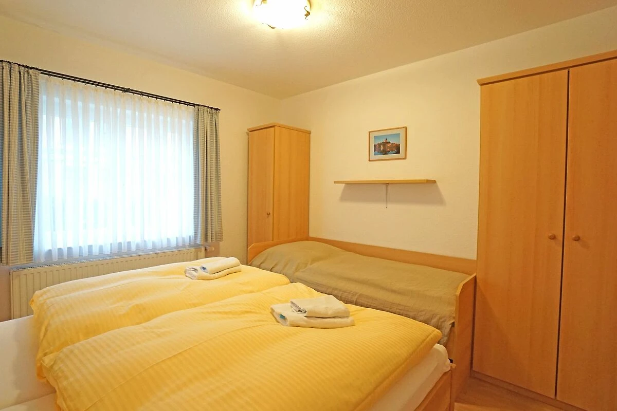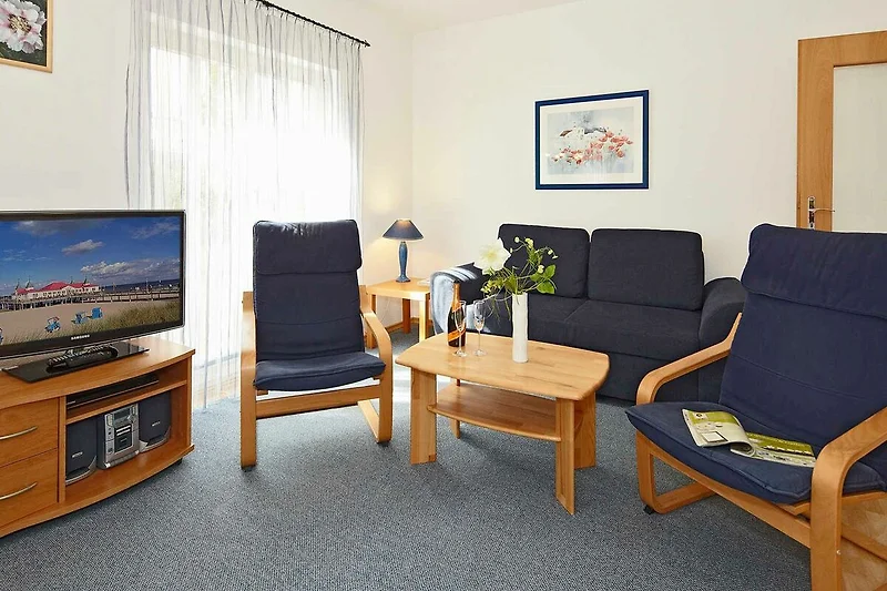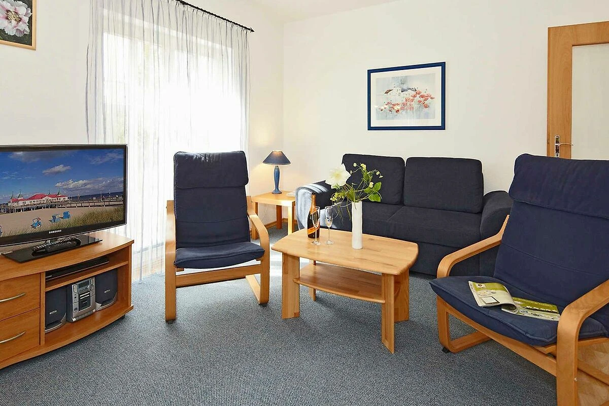 Die hochwertig eingerichtete 2-Zimmer-Ferienwohnung verfügt über ein komfortabel eingerichtetes Wohnzimmer (Flachbildfernseher, DVD-Player, etc.) mit einer komplett ausgestatteten Küchenzeile (Geschirrspüler, Mikrowelle, etc.). Im Erkerbereich des Wohnzimmers befindet sich der Esstisch. Das Schlafzimmer ist mit einem Doppelbett sowie einem Einzelbett ausgestattet (neues Doppelbett 2025). Für Raucher gibt es eine Miniterrasse vor dem Wohnzimmer.