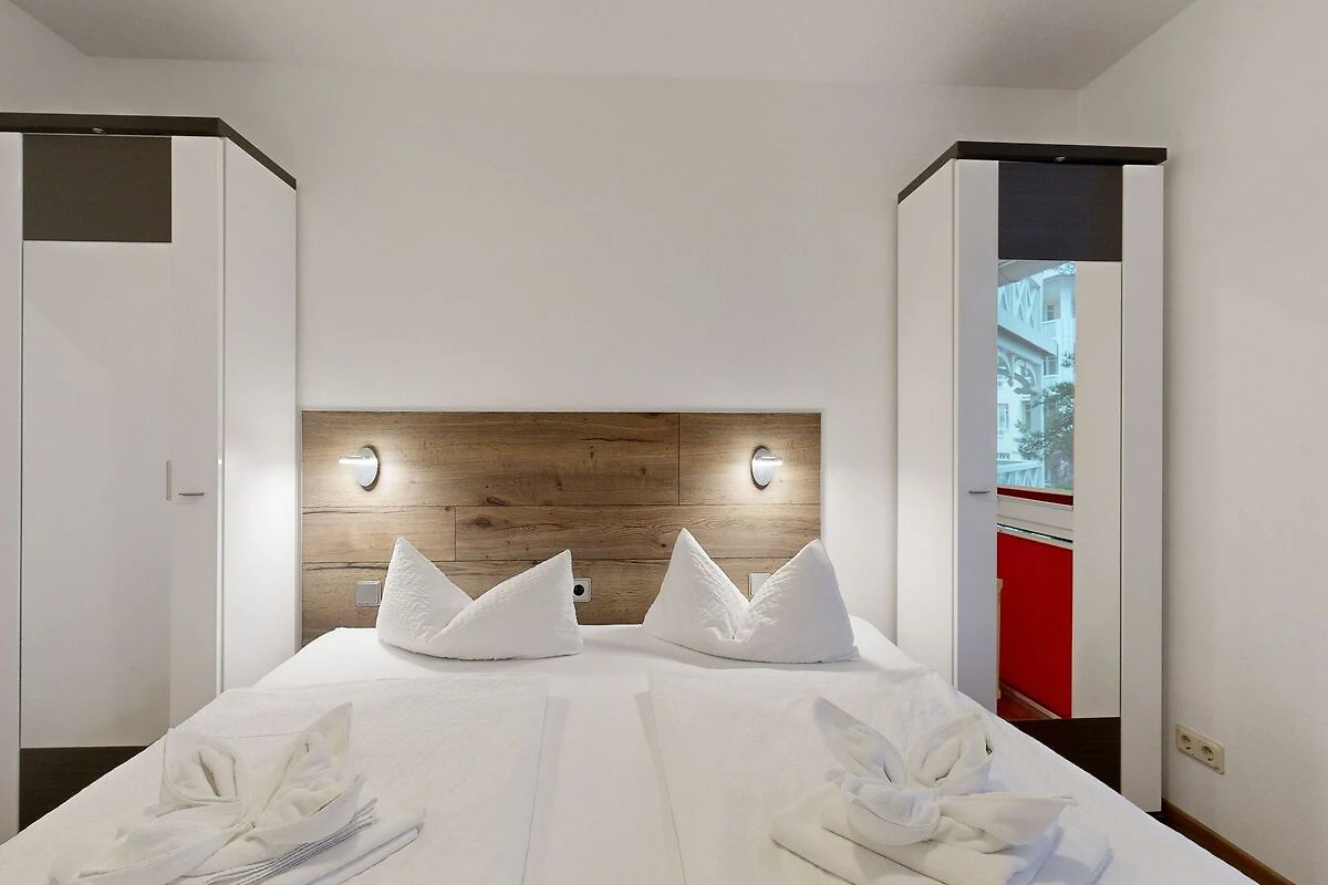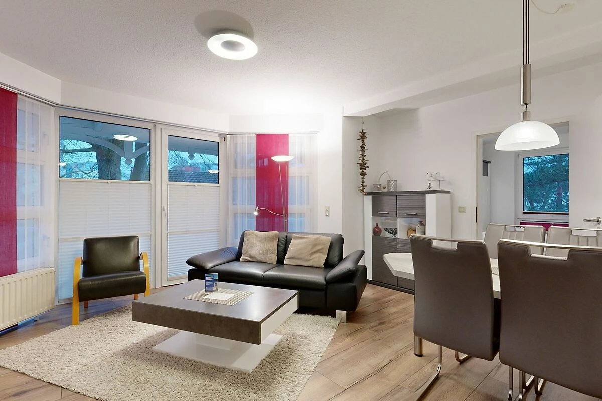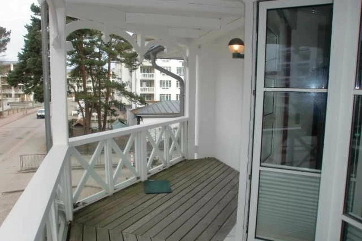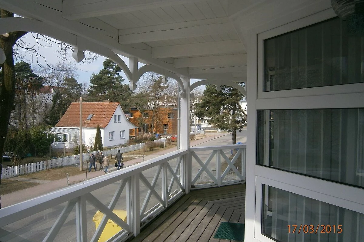 Schöne Komfort-Ferienwohnung im Haus Strelasund in der 1. Etage (3 Zimmer / 66 m²) mit 2 Doppelbett-Schlafzimmern und einem grossen Südbalkon. Das Haus liegt direkt an der Strandpromenade
