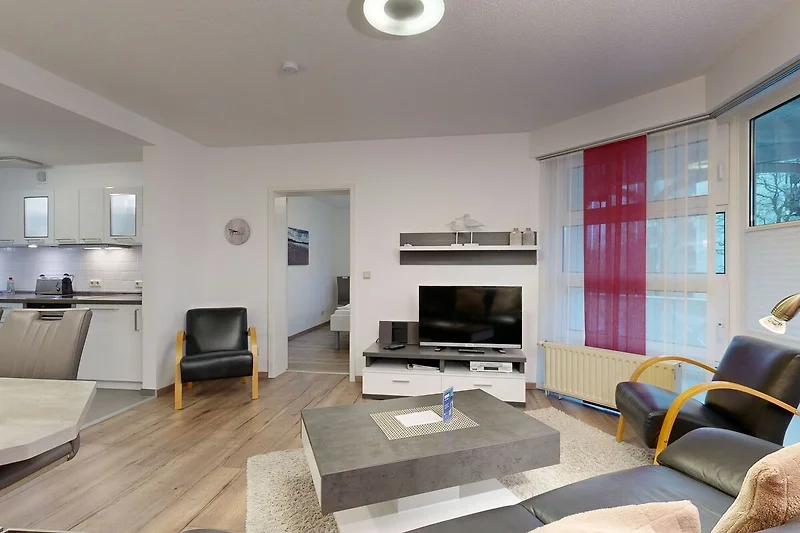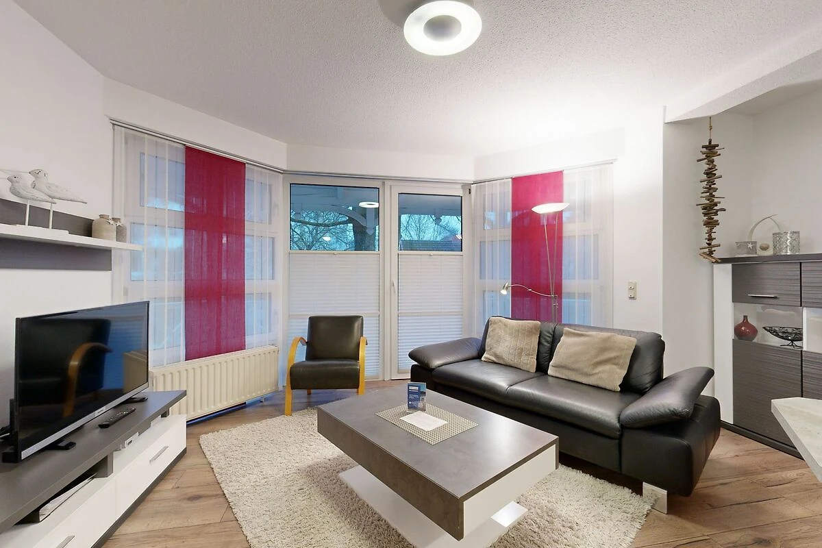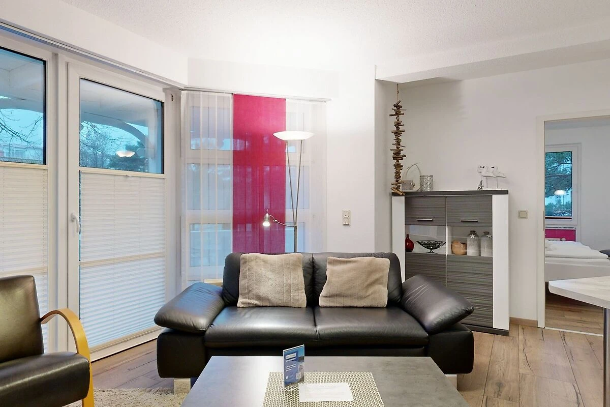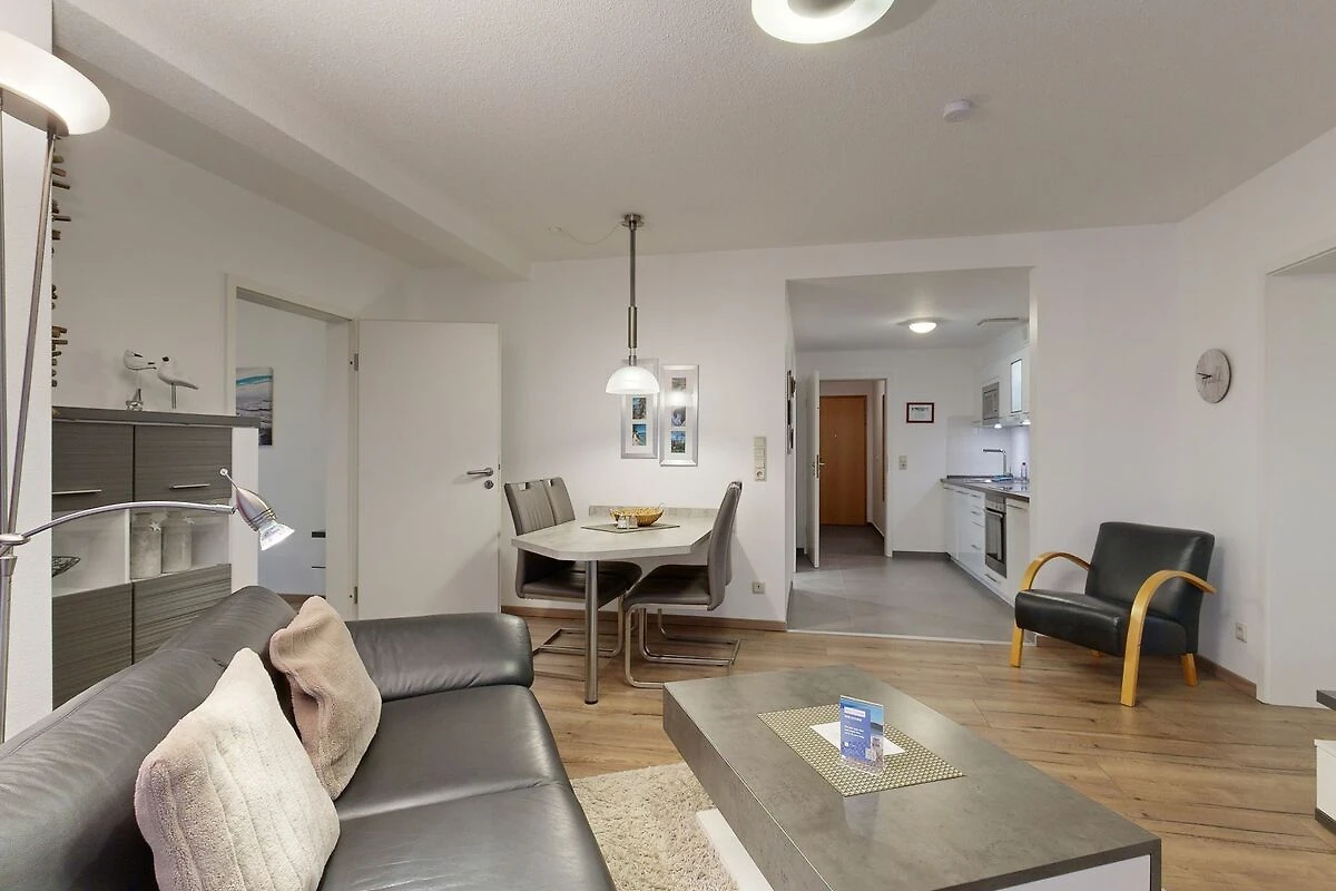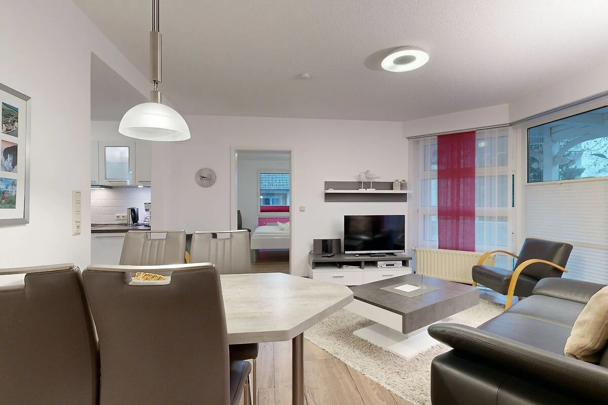 Schöne Komfort-Ferienwohnung im Haus Strelasund in der 1. Etage (3 Zimmer / 66 m²) mit 2 Doppelbett-Schlafzimmern und einem grossen Südbalkon. Das Haus liegt direkt an der Strandpromenade