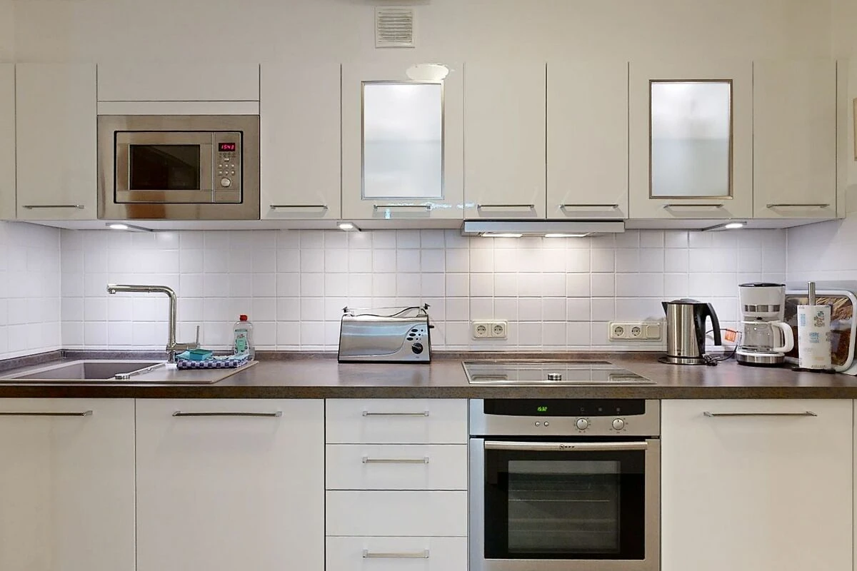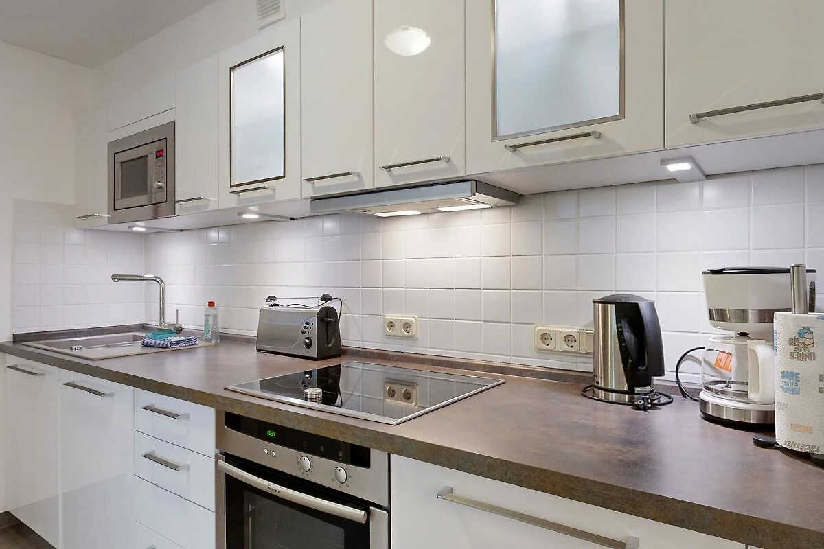 * Küche: Moderne Küchenzeile, Induktionsherd mit Backofen, Spülmaschine, Mikrowelle, Backofen, Wasserkocher, Kaffeemaschine, Toaster