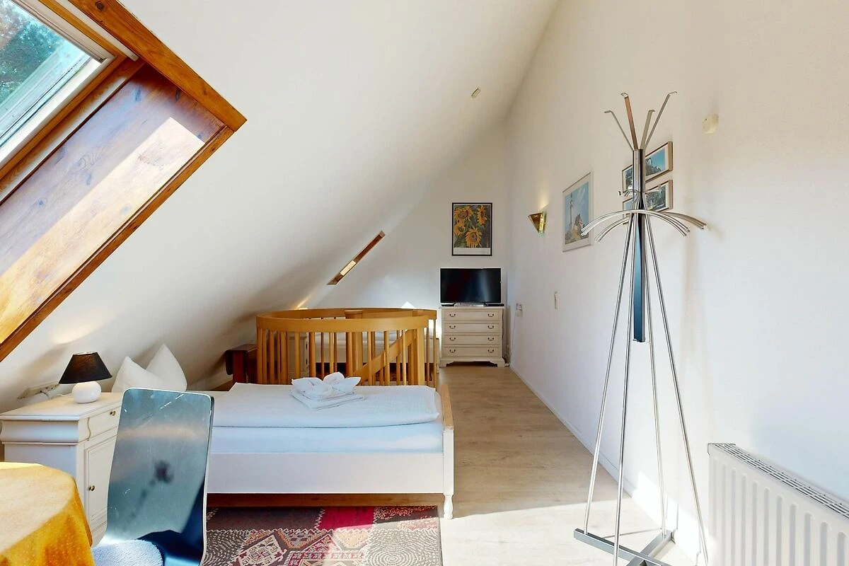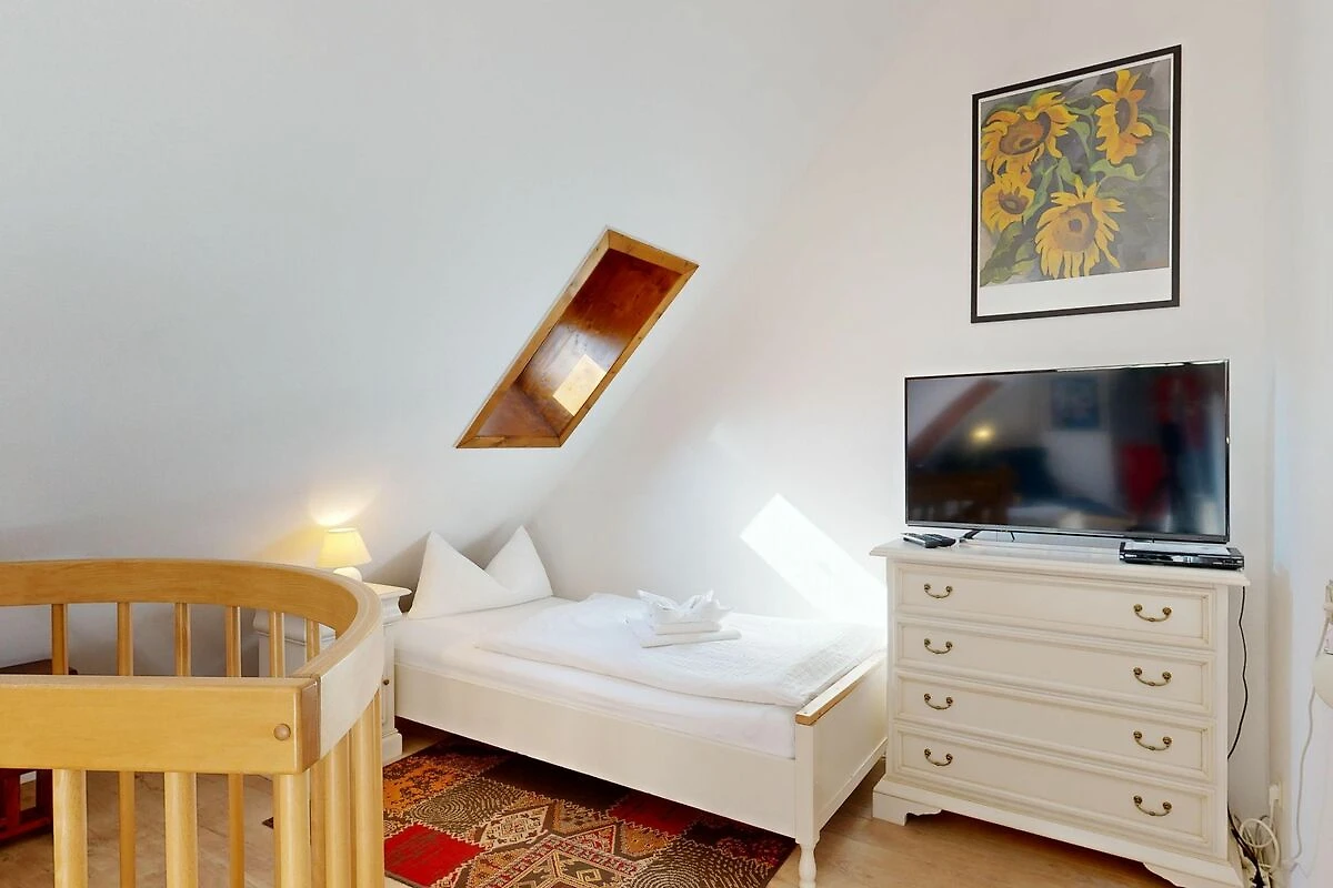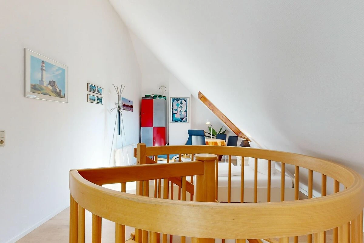 über eine Wendeltreppe mit offenen Zugang gelangen Sie ins Dachgeschoss, wo sich das Schlafzimmer mit den zwei Einzelbetten und dem zusätzlichen TV befindet