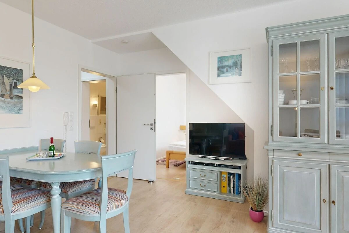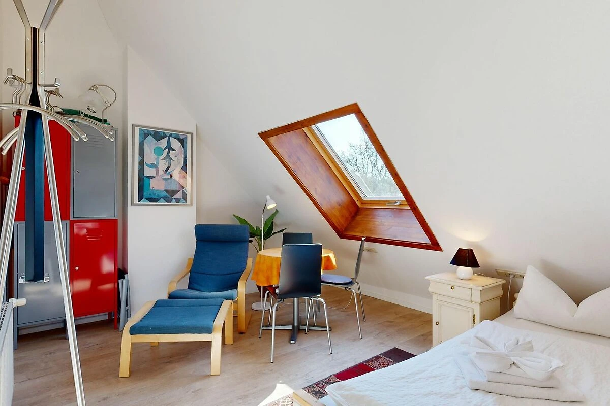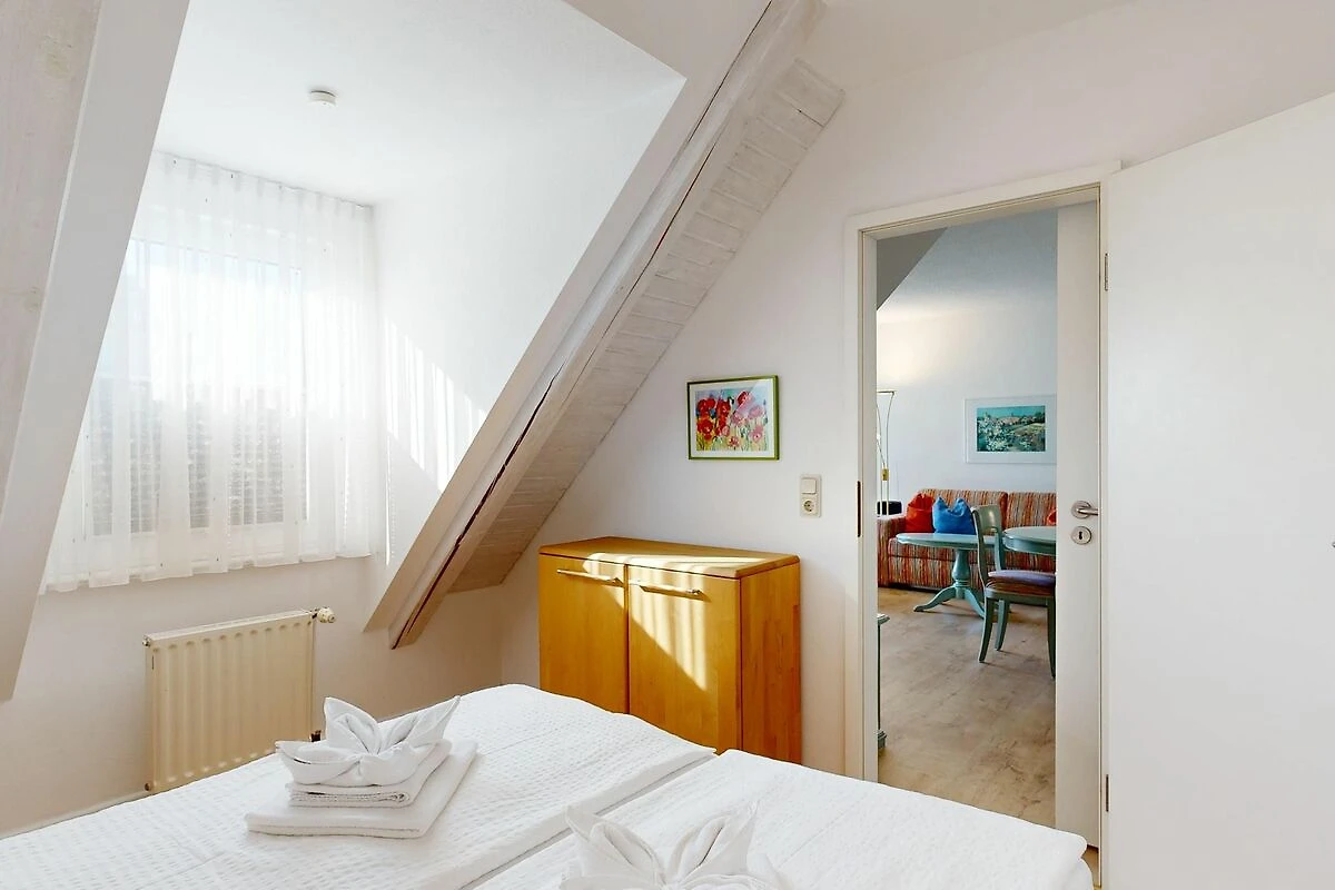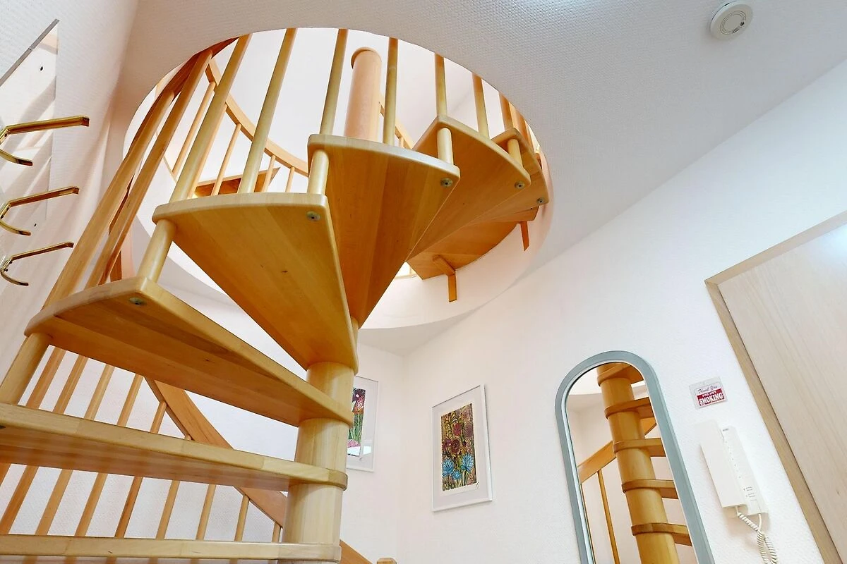 über eine Wendeltreppe mit offenen Zugang gelangen Sie ins Dachgeschoss, wo sich das Schlafzimmer mit den zwei Einzelbetten und dem zusätzlichen TV befindet