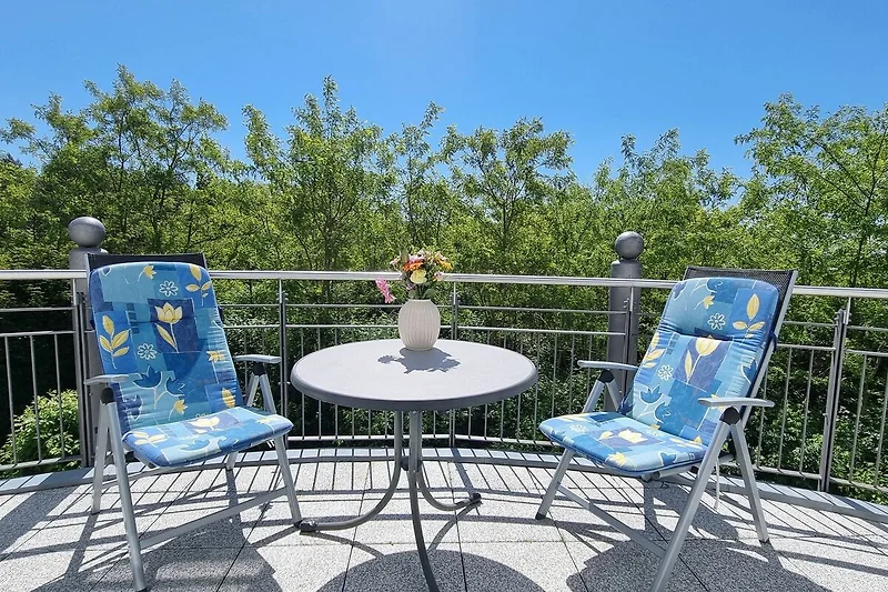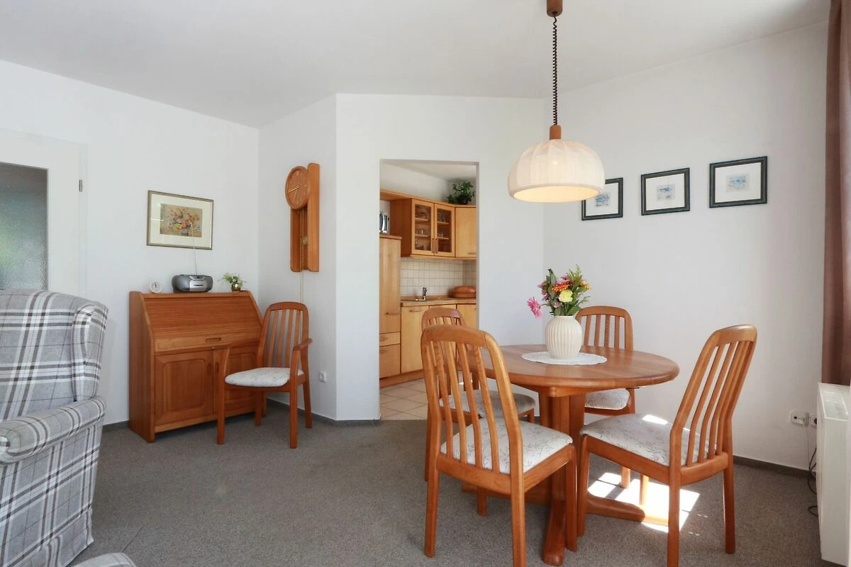 Die 2-Zimmer-Ferienwohnung kann mit bis zu 2 Personen belegt werden (ca. 51 m²) im 1.OG mit Wohn- und Esszimmer, 1 Küche, 1 Schlafzimmer, 1 Bad und 1 Balkon.