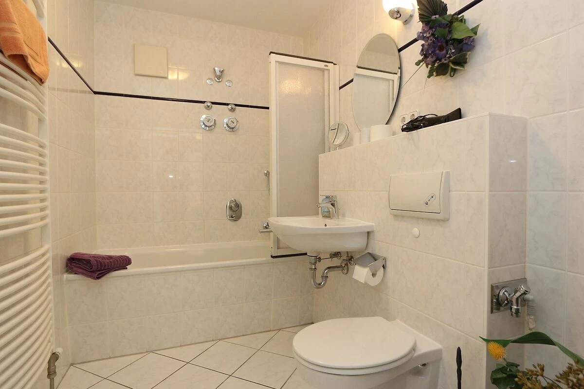 • Bad mit Badewanne und Duschabtrennung und Handtuchtrockenheizkörper.