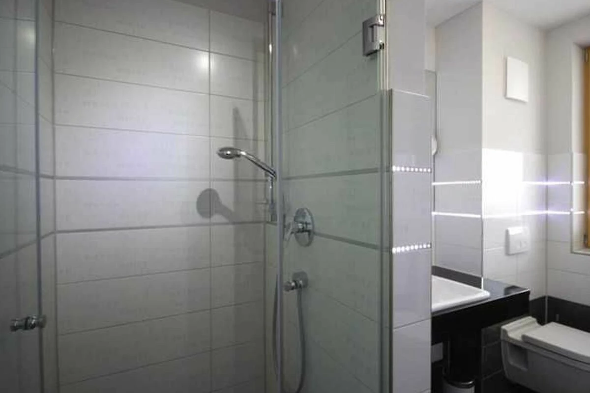 Das grosszügige moderne Badezimmer mit Fenster verfügt über eine bodengleiche Dusche, Fön, beleuchteten Kosmetikspiegel und Badhocker. Die besonders gestalteten Fliesenwände mit LED-Licht machen aus dem Bad eine Wohlfühloase.